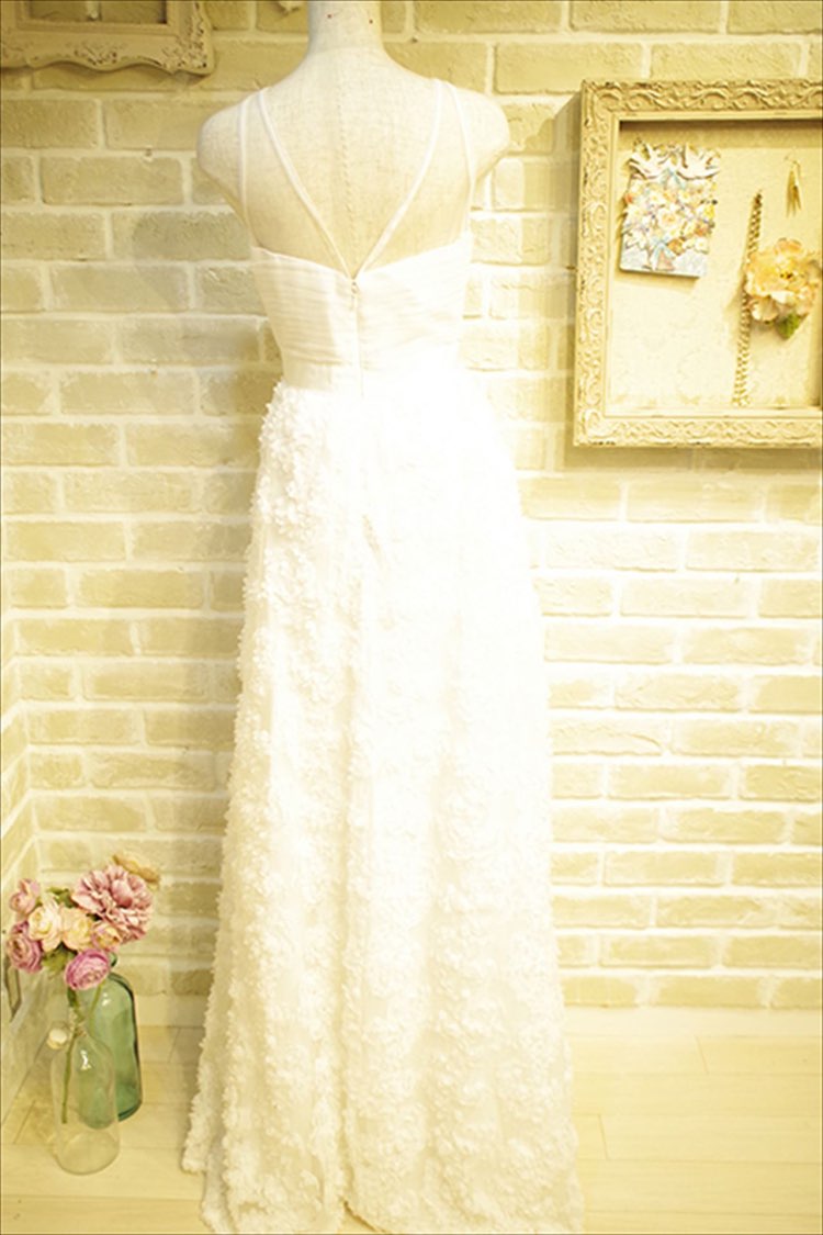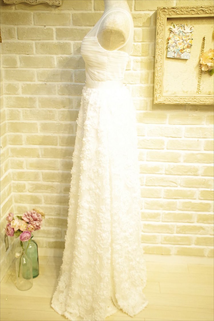 胸元は綺麗にデコルテが見えるようにVネックにカットされており、肩はシースルーメッシュになっていて抜け感もバッチリです。スカートあh立体的なお花デザインで華やかで個性的なデザインが印象的なウェディング向きドレスです。個性的でおしゃれ花嫁さんにオススメなAラインのボリュームドレスです。別途パニエを入れれば歩きやすく、より華やかな印象になります。花嫁さん用のドレスとしてだけでなく演奏会や表彰式、発表会、お誕生日パーティーなど主役なかたにおすすめな一着です。
