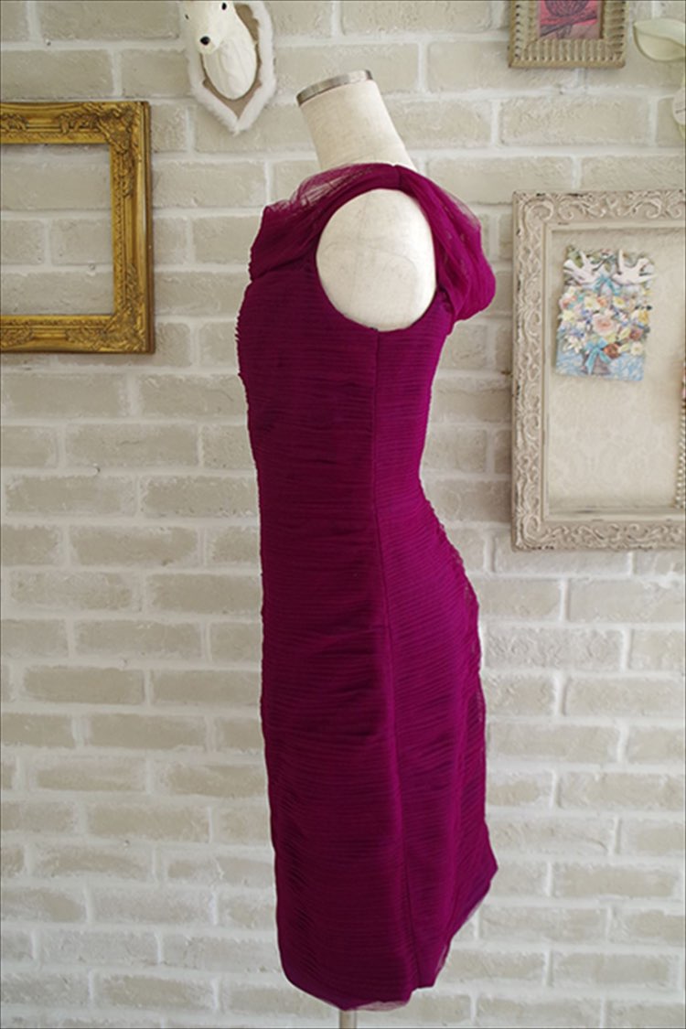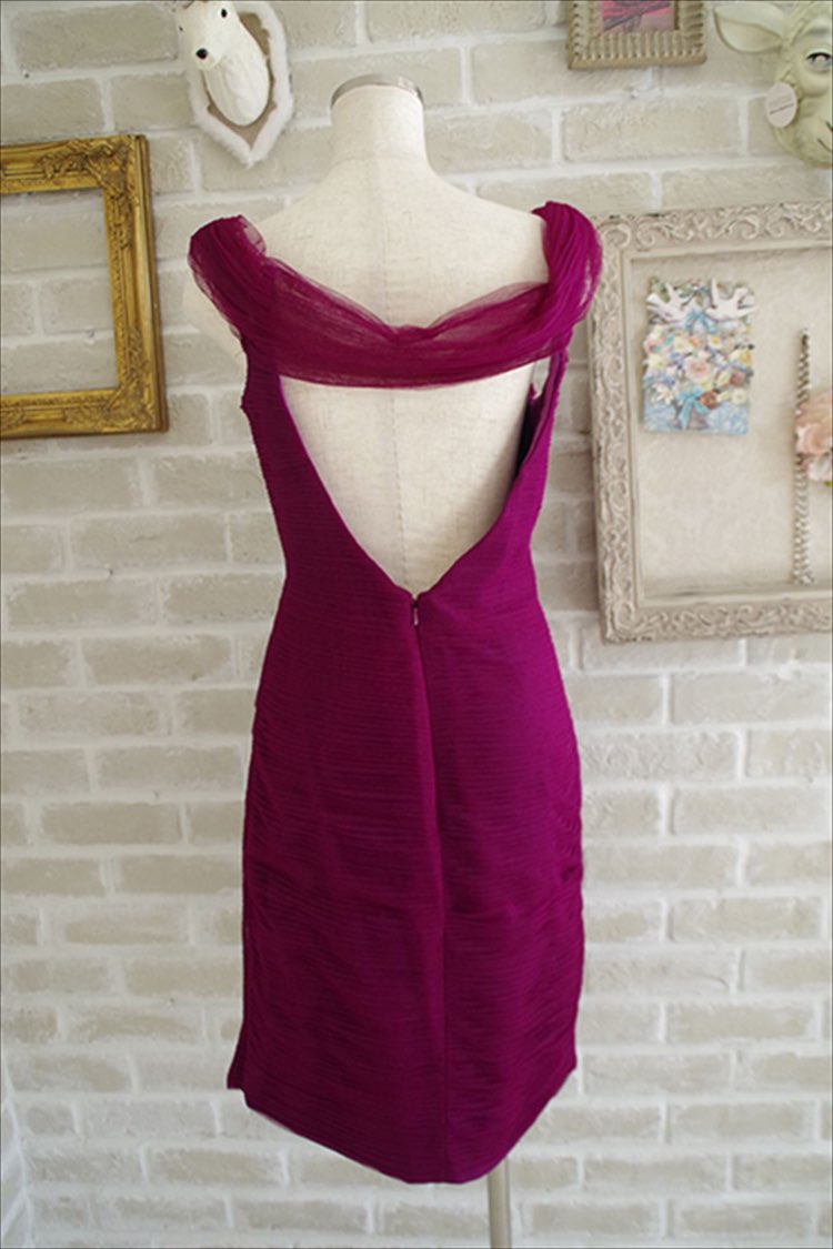 着映え力抜群のパープルカラードレスです。大人の雰囲気を醸し出す、赤みがかった色合いがセレブ風の着こなしに。オシャレなオフショルなので、お洒落をリードしたい方にもぴったりです。 背中部分のV字でトレンドのこなれ感も演出! 素敵に女性オーラを感じさせることができますよ。 上品かつ洗練された印象は、ミセス世代にもおすすめしたい一着。 羽織物なしで、華やかなパーティシーンにもOK! いつもとは違うドレスカラーで、会場を華やかにしてみてはいかがでしょう?