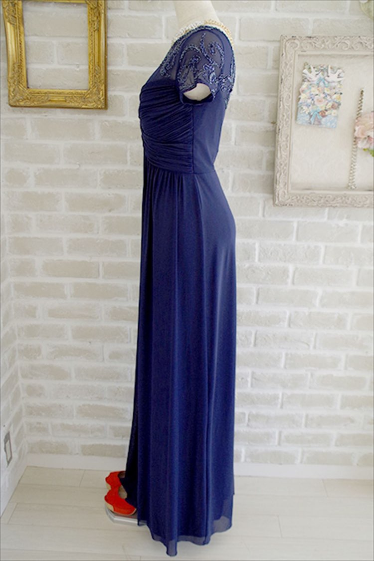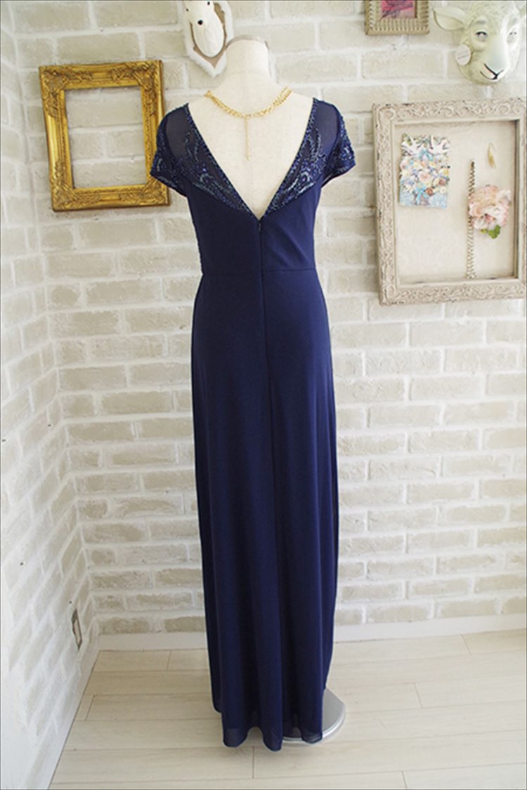 マーメイドのような優雅で美しいシルエットで魅了するネイビーカラーのドレス。透け感のあるレースデザインが上品に女性らしい色気を漂わせます。大胆なバッグスタイルで360度エレガントに、特別感を演出。 ストレッチ素材で身体のラインを綺麗に拾い、しなやかな着こなしをお楽しみいただけます。 ショールと合わせた、さらに艶やかなコーディネートがお勧め。 ナイトウエディングやパーティー、発表会などのシーンを華やかに彩ってくれる一着です。