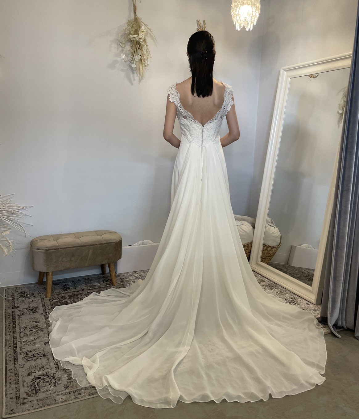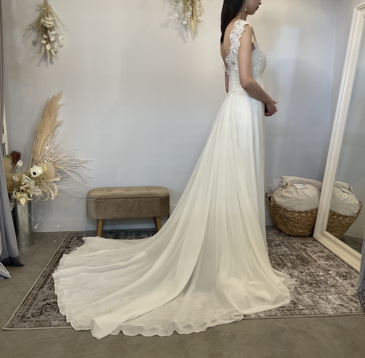 エレガントで優しいクリーム色のドレスです。胸元にあしらわれたレース刺繍からは大人の気品溢れる雰囲気が漂います。後ろに大きく広がるトレーンは、一生に一度のかけがえのないウエディングをラグジュアリーに彩ってくれるはずです。 結婚式やナチュラルテイストのウエディングパーティーにぜひ♪