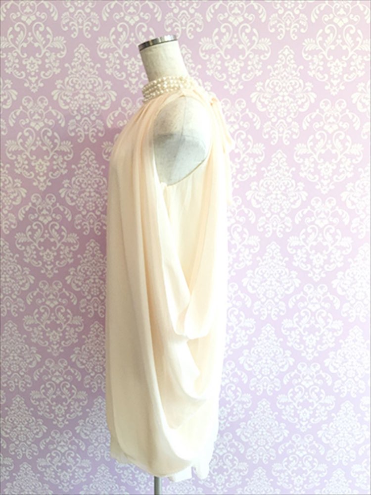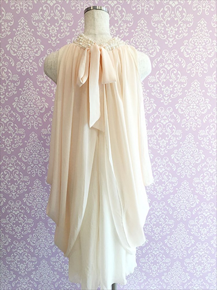 華やかで主役級な着こなしへと導いてくれる、ほんのりピンクカラーのドレス。すっきりとしたデザインが大人かわいい女性にぴったりです。首元にはビジューがついており華やかでエレガントな一着です。
