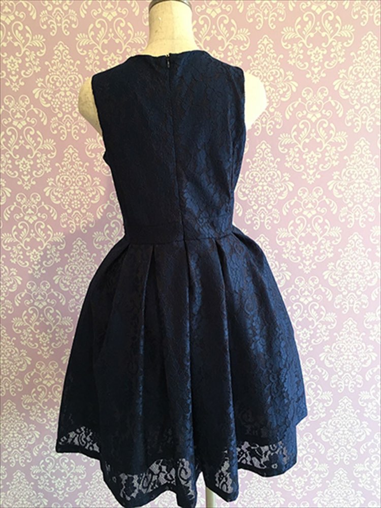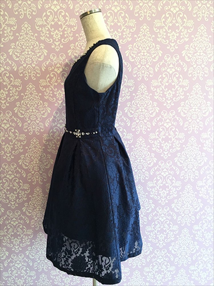 全体のレースが印象的なネイビーカラーのドレスです。ウェストについたビジューがアクセントになっていて華やかです。ウェストラインを綺麗に見せてくれて、脚長効果もあります◎ おしゃれな大人のドレススタイルをお楽しみいただける一着に仕上がっています。 小物はイエローやビビッドピンクと相性が良く、差し色を入れたコーデがおすすめです。