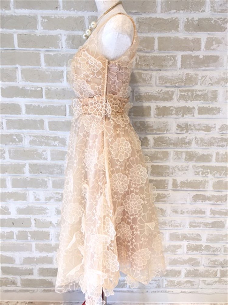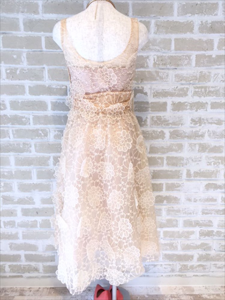 薄めのベージュカラーで優しげな印象のドレスです。全体にあしらわれたお花のデザインが印象的な一着。とても可愛らしいですがミモレ丈なので大人女子にもおすすめ♪ すっきりと魅せるラインでスタイルアップ効果抜群なので、低身長の方にも着ていただけます。 パーティー、女子会などにもぜひ!
