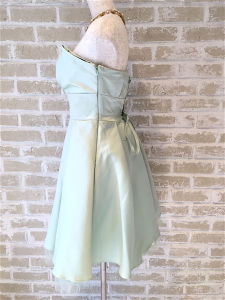 ほんのりグリーンの春らしいマカロンカラーのドレス。スカートのチュール素材は可愛らしいイメージを与えます。ミモレ丈なのでベアタイプでも露出の多い印象がなく上品です。 バックが編み上げなので身体にフッィットした美しいボディラインを演出できます。 ボレロやストールを合わせてお友達の結婚式にぴったりなコーディネートに仕上げてみてください♪