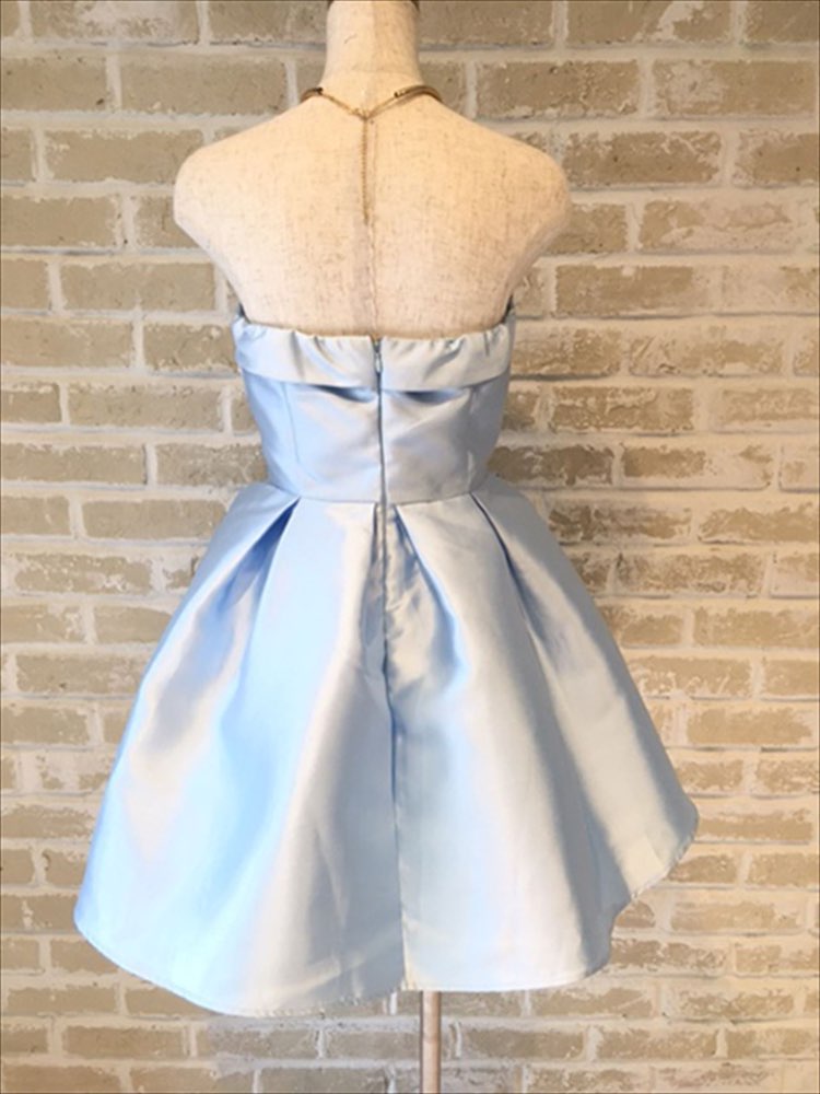 しっかりとした生地感のミニベアドレス。胸元の折り返しデザインでベアドレスながら上品な印象を与えます。レースの刺繍が乙女心をくすぐりますね♪ シンデレラカラーのこのドレスには、ぜひキラキラと揺れるイヤリングを合わせてみて! 謝恩会や各種パーティーにおすすめです。