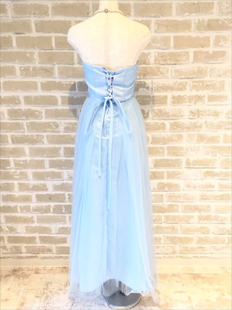ライトブルーの涼しげなマキシ丈ドレスです。Drerich横浜店には全部で4着ご用意があるので、ブライズメイドにもオススメです。バックが編み上げスタイルなのでサイズの調節も可能です。