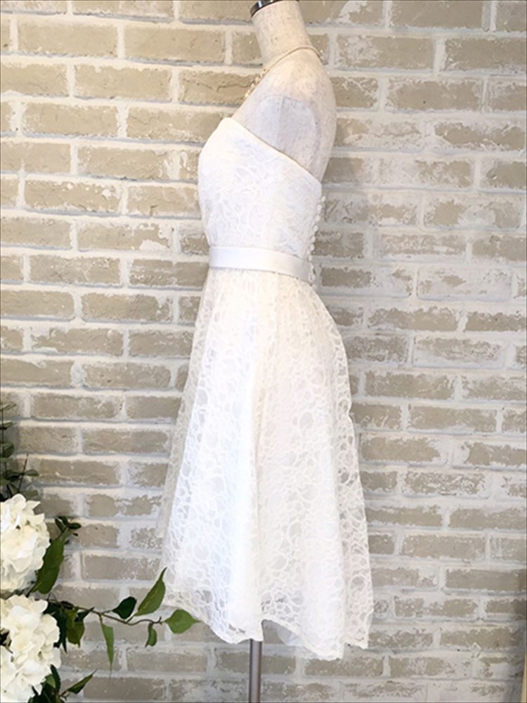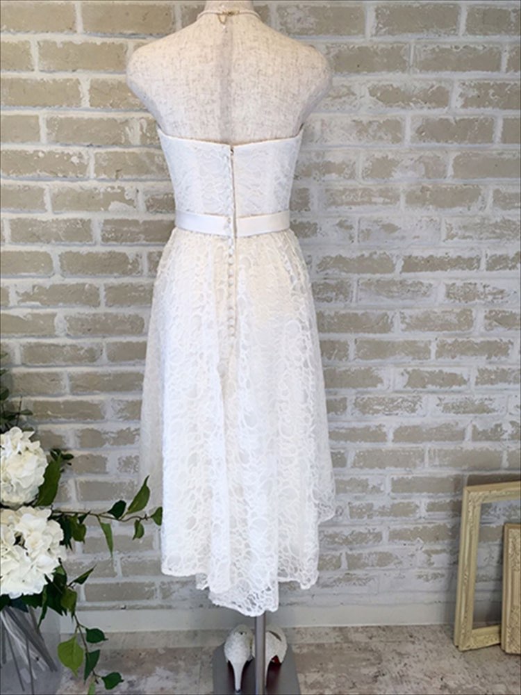 清楚で可愛らしい印象の一着。ひざ丈なので上品で、かつ気取らないイメージをあたえます。レース感がガーデンウエディングや二次会にぴったり◎