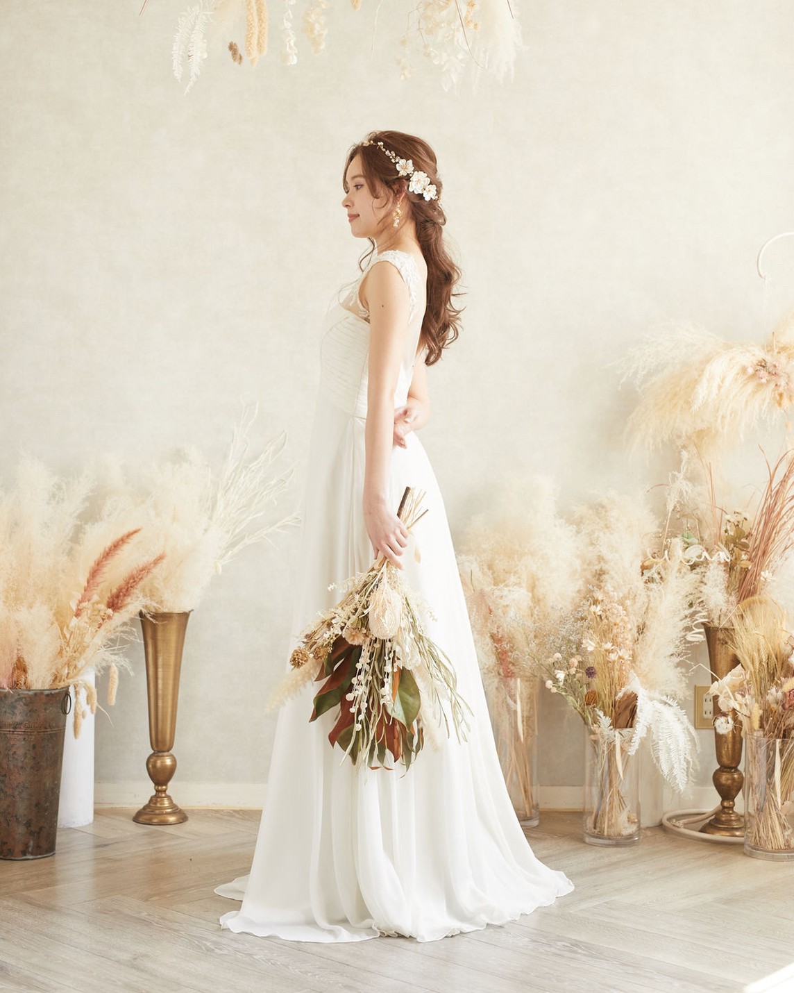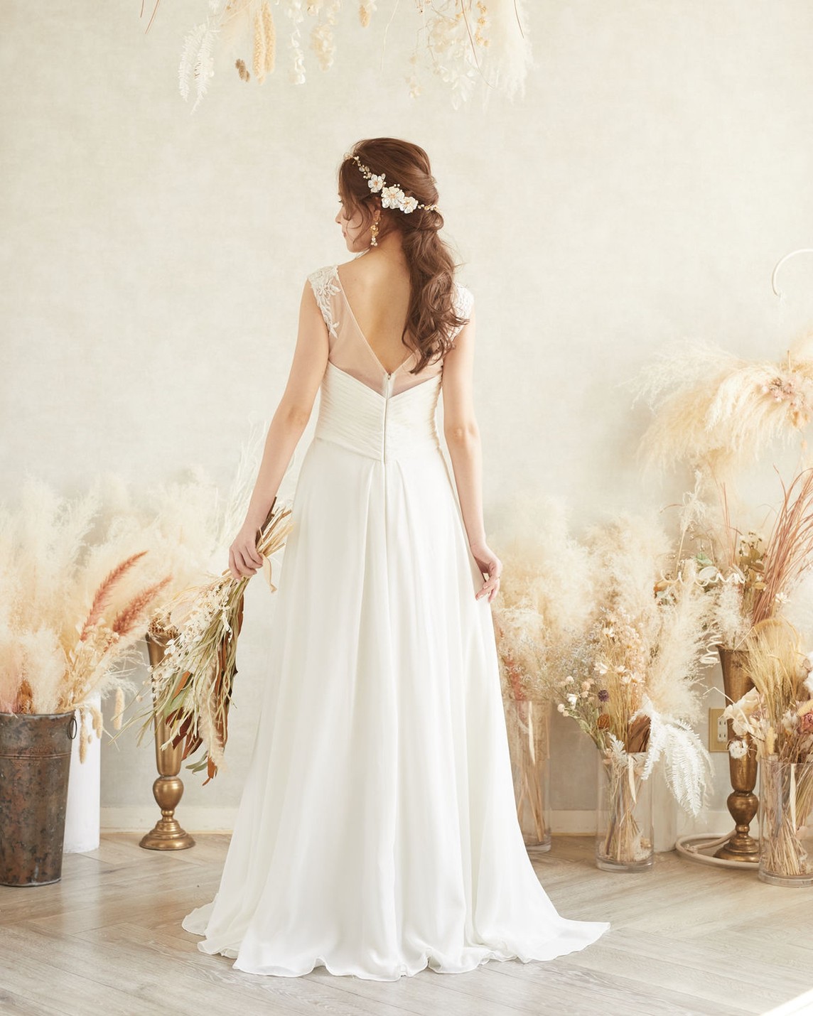 繊細なレースとチュールで仕立てた胸元のクロスデザインが、デコルテを美しく魅せ、女性らしい柔らかさを演出。軽やかなシフォン素材のAラインシルエットは、どなたにもフィットしやすく、歩くたびに優雅に揺れます。背中はVカットで程よい抜け感があり、後ろ姿もエレガントに。 ナチュラルウェディングや前撮り、ガーデン挙式にぴったりの、上品で大人可愛い一着です