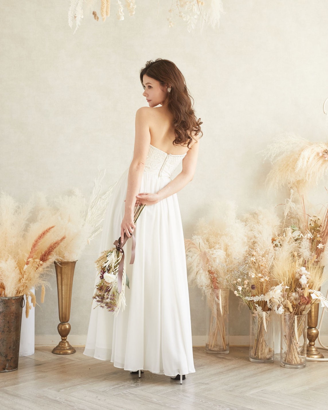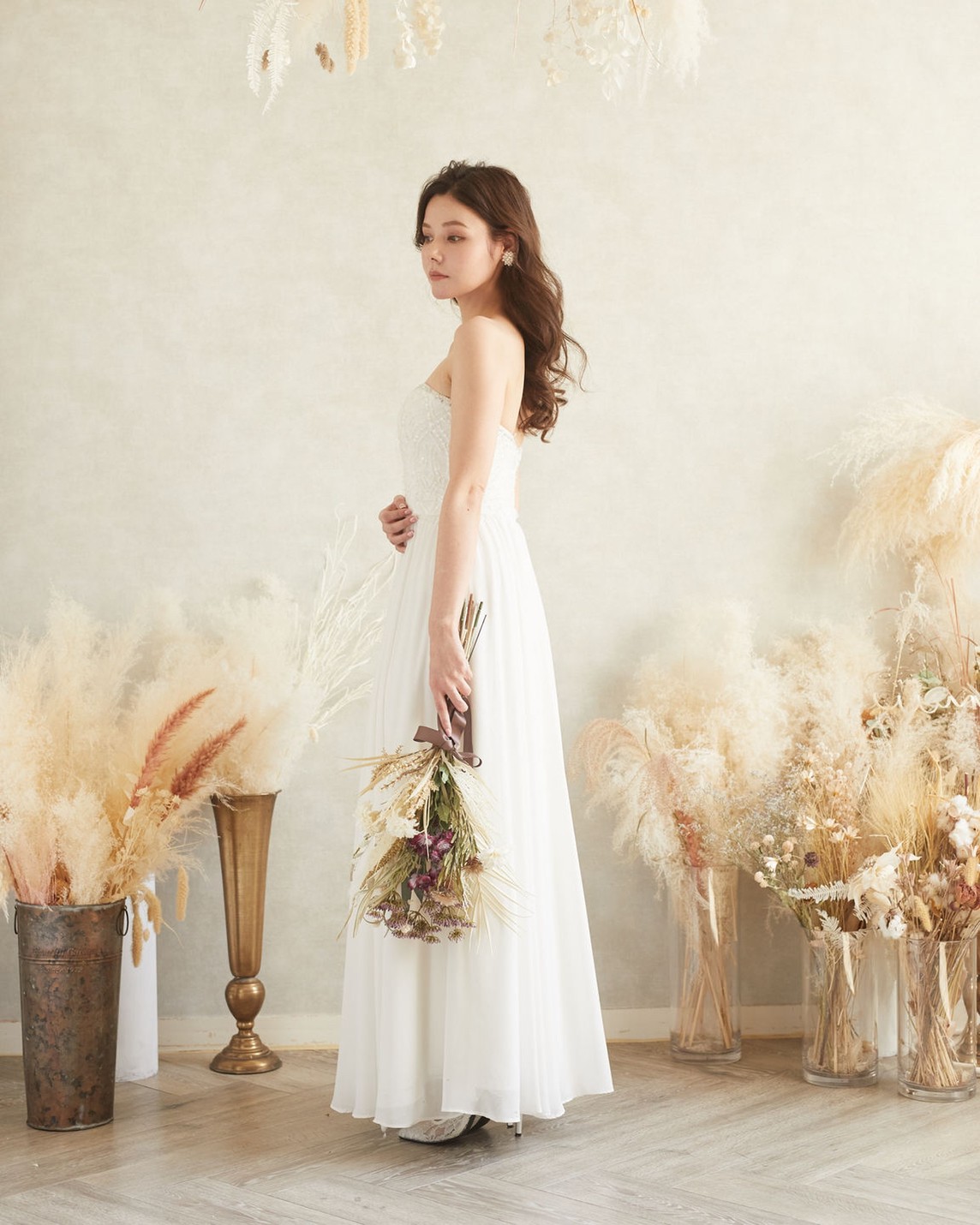 胸元にビジューがあしらわれたナチュラル目なドレスです。シンプルながらも細部にこだわりが見られ、大人のウエディングにぴったりな一着に仕上がりました。アンクル丈なので動きやすやも抜群です!