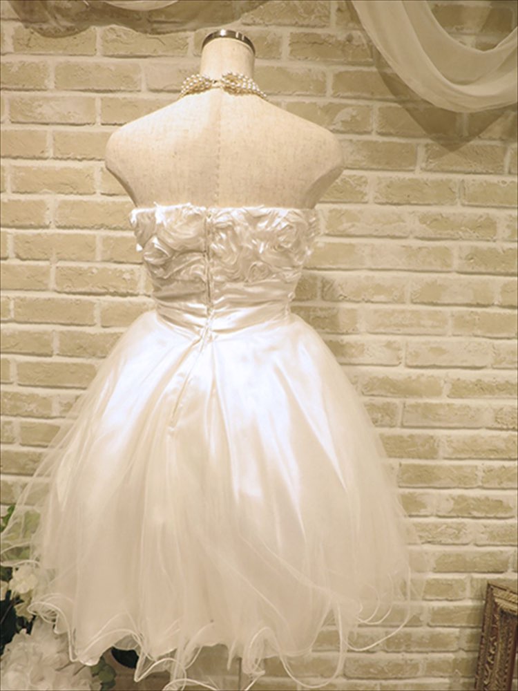 フリル×オーガンジーの可愛らしさ満点のミニ丈ドレスです。ウエストが高い位置で切り替えられているのでスタイルアップして見えます。切り替え部分がリボンデザインになっているのも乙女心をくすぐりますね♪ パニエを履いてボリューム感を足すスタイルが人気です。 とびきり可愛いドレスをお探しの花嫁様にぴったりの一着です。