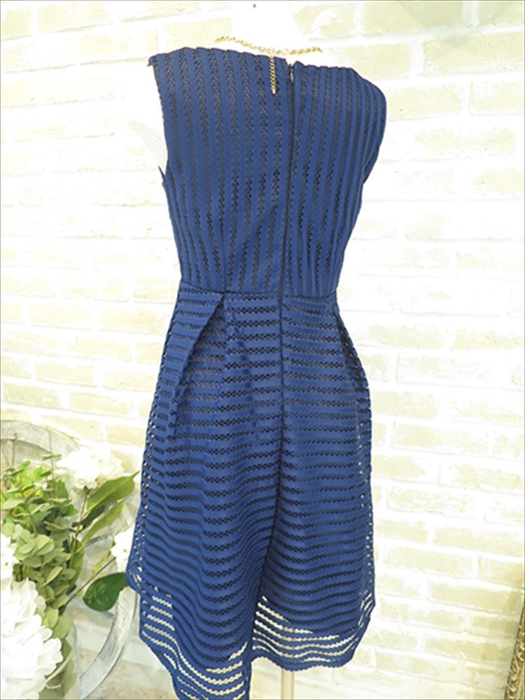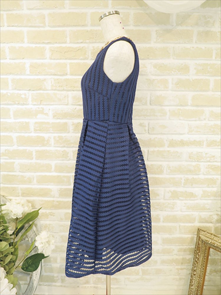 落ち着いたネイビーカラーのドレス。レースのような生地感で可愛らしい印象をあたえます。首元がつまったデザインなので、安心感があります。 人気のフィット&フレアのタイプなので美脚効果も抜群◎ 一枚でさらりと着こなして女子会にも、ボレロを羽織ってお友達のウエディングパーティーにもぴったりな一着です。