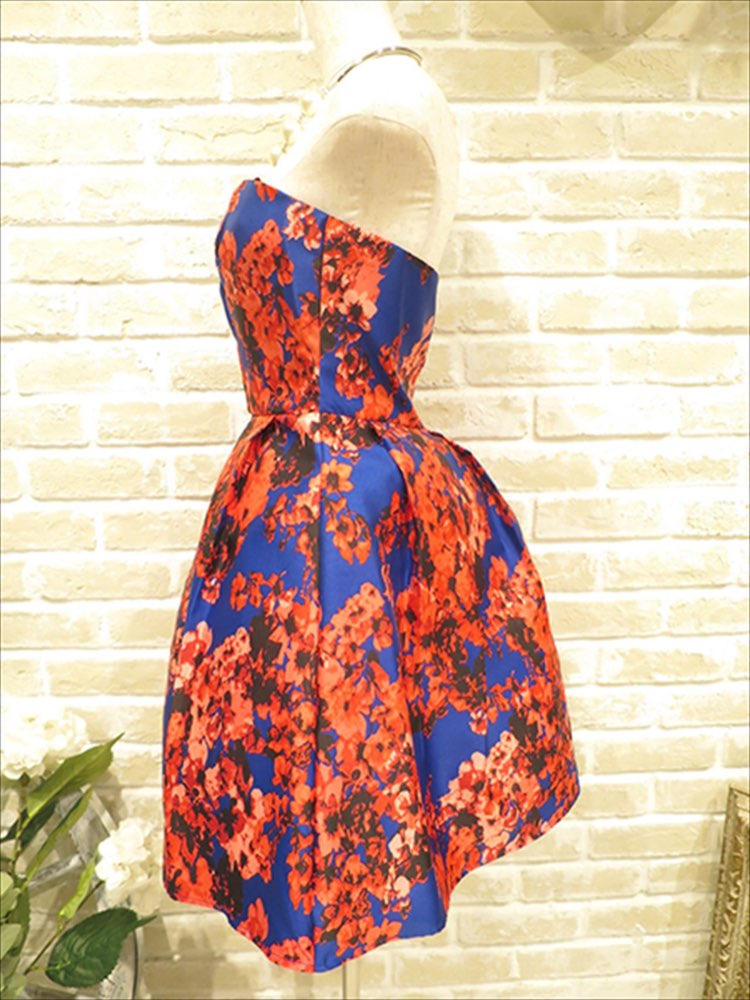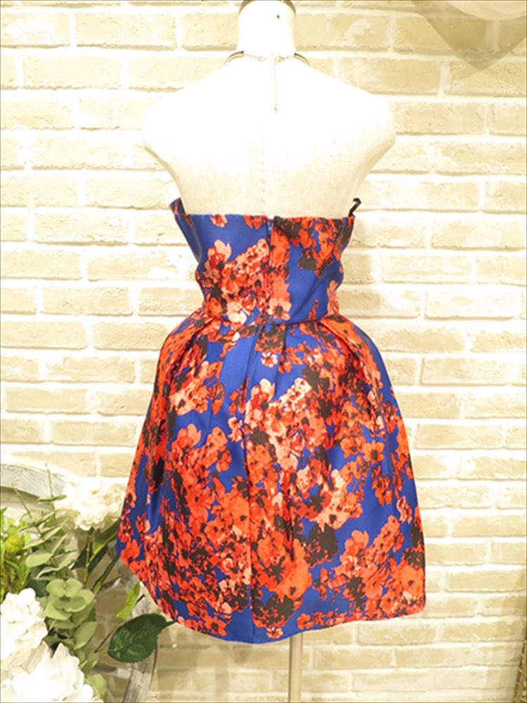 ビビッドなブルー地に反対色であるレッドカラーの大きな花柄がとても珍しい色合わせでとっても印象的なミニドレスです。花柄が大柄なので子供っぽくはなりすぎない大人かわいいドレスです。胸下切り替えなので脚長効果、着痩せ効果も期待できます。パニエを入れるとよりふわっとして華やかになりますよ。絶対に他の方とは被りたくない個性派さんにおすすめ。ミニ丈なので結婚式二次会や謝恩会パーティーにオススメです