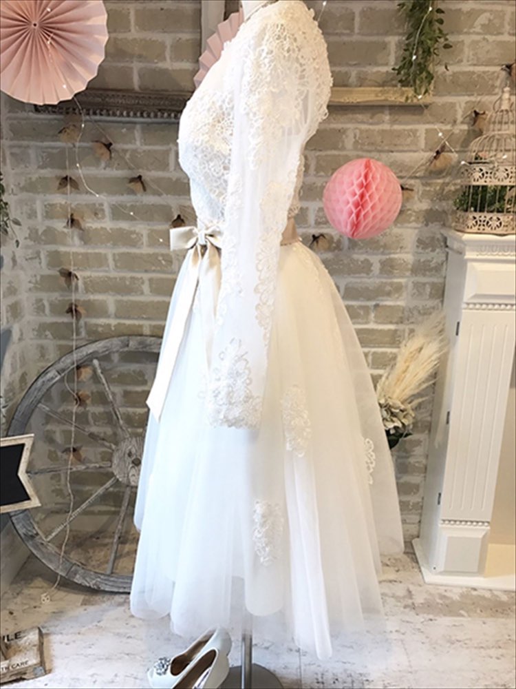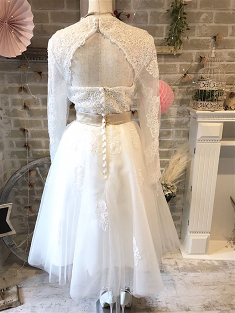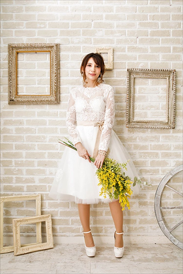 大きく丸く開いた背中とレースアップ仕様のつなぎ目が印象的な人気のミディ丈のロングスリーブドレスです。ウェスト切り替えでウェストにベージュのリボンがついたデザインなのですっきりとして見え着痩せ効果抜群です。10分丈の袖はフルレースの中に刺繍があしらわれ、 上品さの中に透け感もプラス。素材はトロッとした柔らかなシフォン生地です。 クラシカルな印象を与えつつ、花嫁様のエレガントさを引き立てます。結婚しの二次会やウェディングフォトにオススメの一着です。