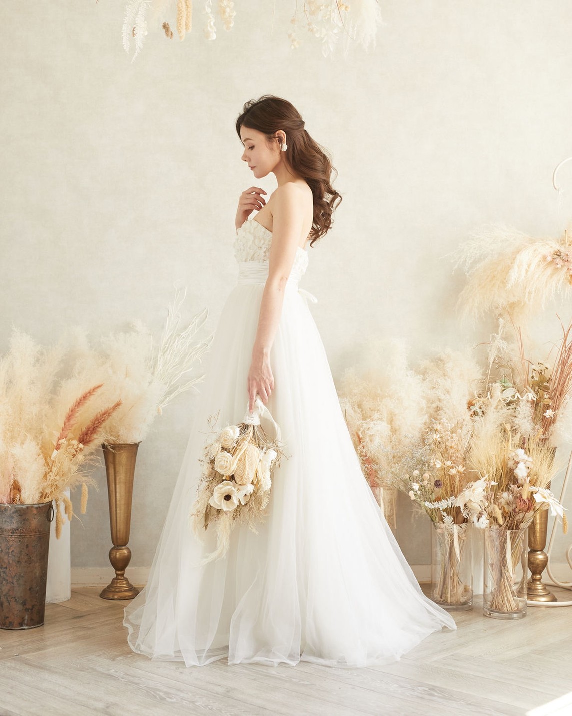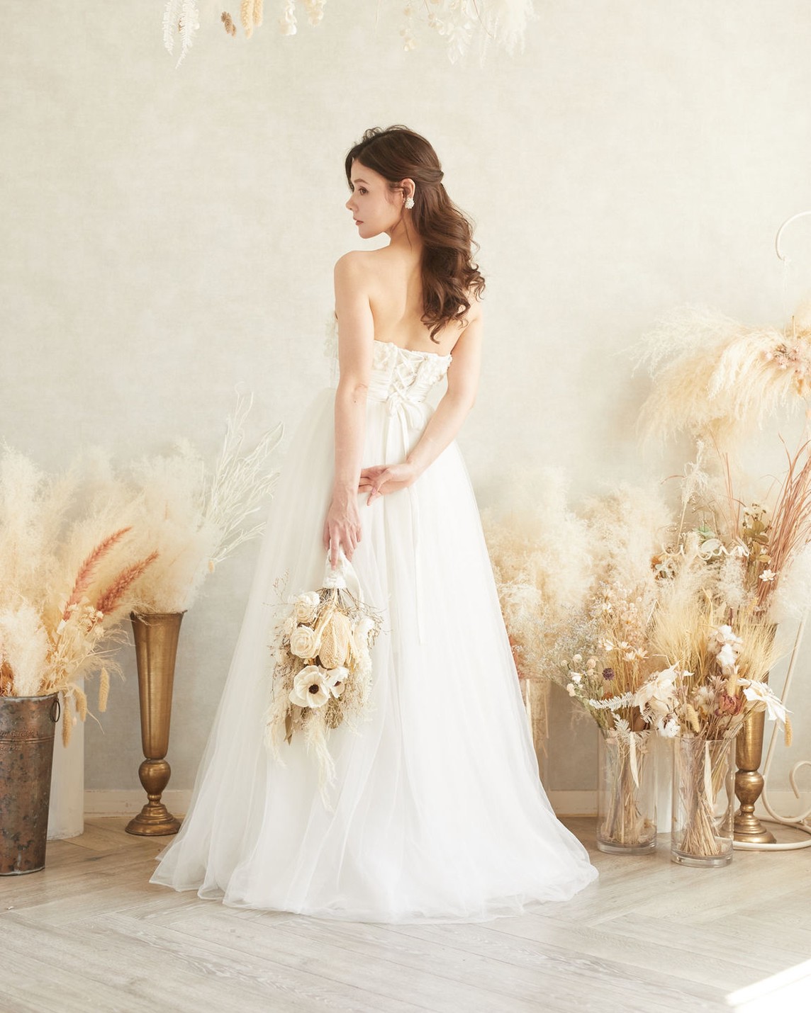 胸元に立体的なお花柄のレースが贅沢に使われた、大人気のチュールベアAラインドレスです。胸元についたお花でキュートな印象の胸下切り替えドレスなので脚長効果と着痩せ効果のあるドレスです。丈感も動きやすいアンクル丈です。結婚式二次会や1,5次会、フォトウェディングにお勧めのドレスです。