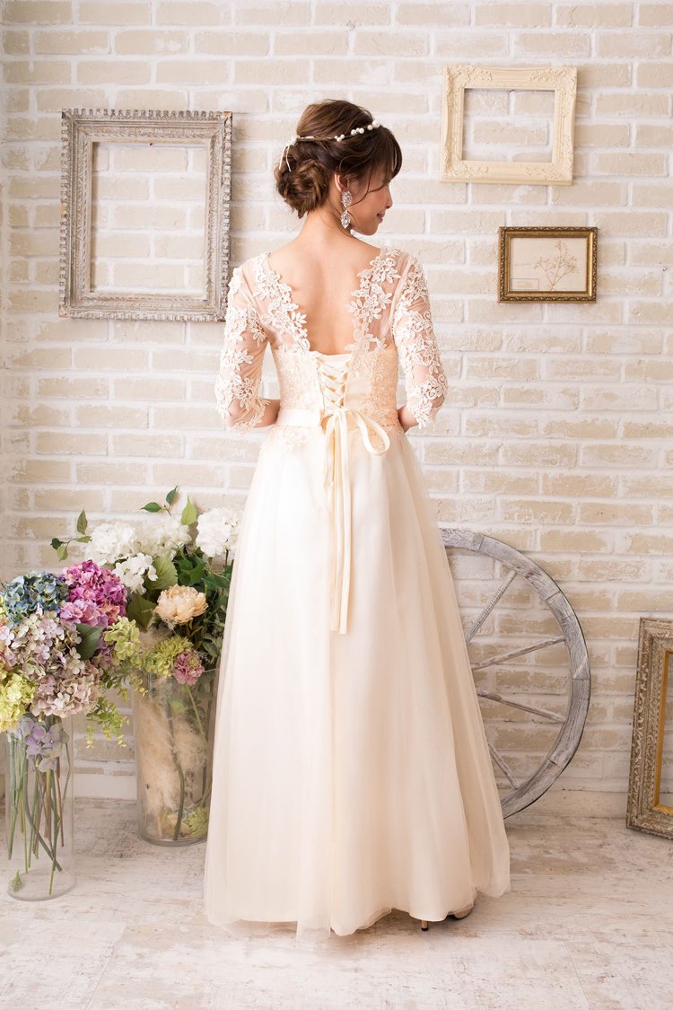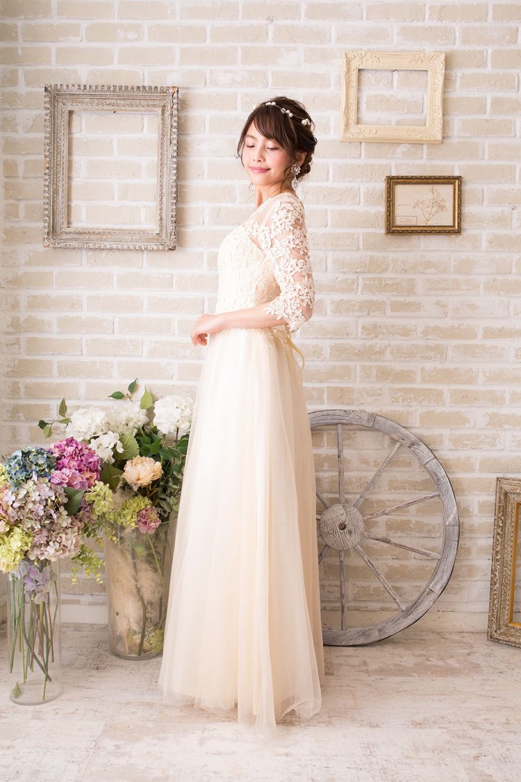 すこし黄身がかったクリームカラーで、トップスと袖全体に少し立体的なレースが贅沢に使われた、ナチュラル系がお好きな方や、ガーデンウェディングにとっても合う大人気のチュールの長袖スレンダーラインのドレスです。胸元についたお花でキュートな印象のウェスト切り替えで着痩せ効果のあるドレスです。丈感も動きやすいアンクル丈です。結婚式二次会や1,5次会、フォトウェディングにお勧めのドレスです。