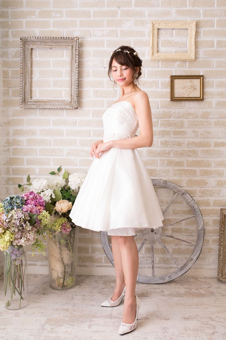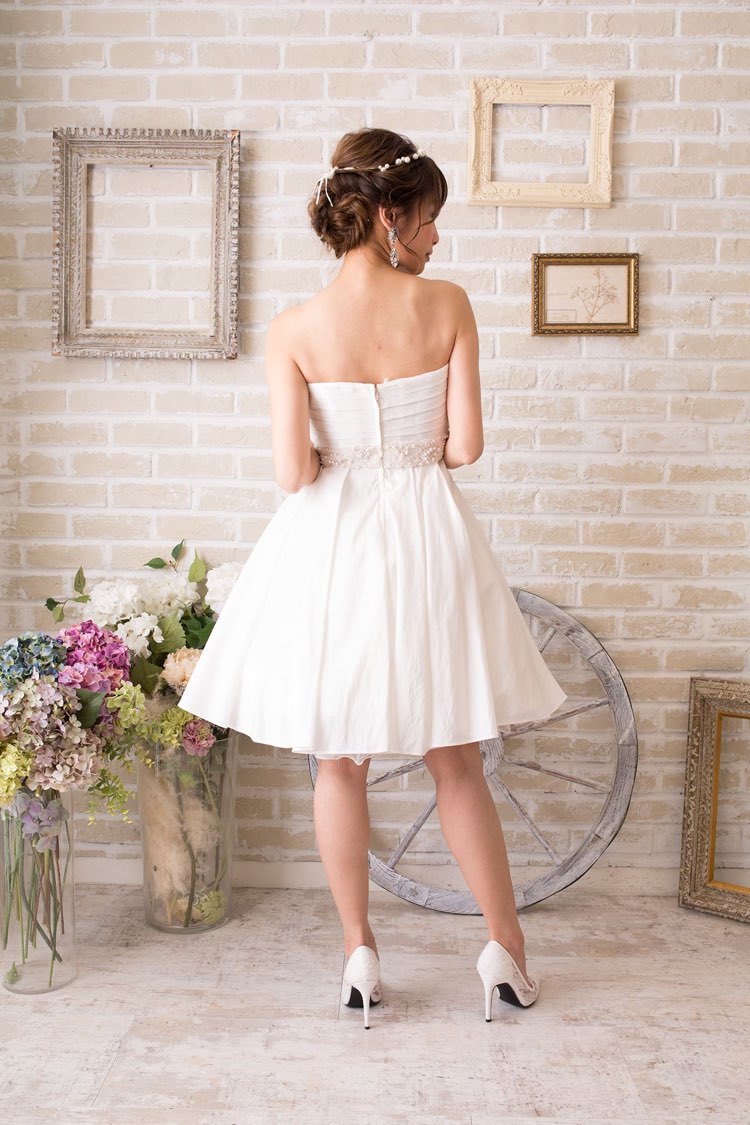 オフホワイトカラーで、ウェストにパールとビジューが贅沢に使われた、大人気のミディー丈スカートのベアドレスです。ハリのあるシャタン生地が素敵です。ウェスト切り替えドレスなのですっきりと見え着痩せ効果のあるドレスです。別途パニエを入れるとよりボリュームが出て素敵ですよ。結婚式二次会やフォトウェディングにお勧めのドレスです。
