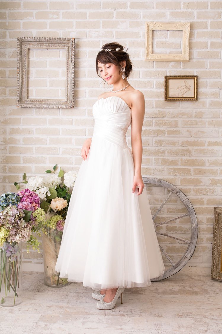 人気のチュールスカートのミモレ丈の胸下切り替えのベアドレスです。胸下切り替えでクロスされたデザインなのでウェストすっきりで綺麗なボディーラインを演出してくれる横浜店で大人気のドレスです。シンプルでラインが綺麗なドレスがお好き花嫁さんにオススメ。パニエを入れるとより一層華やかになるのでオススメです。