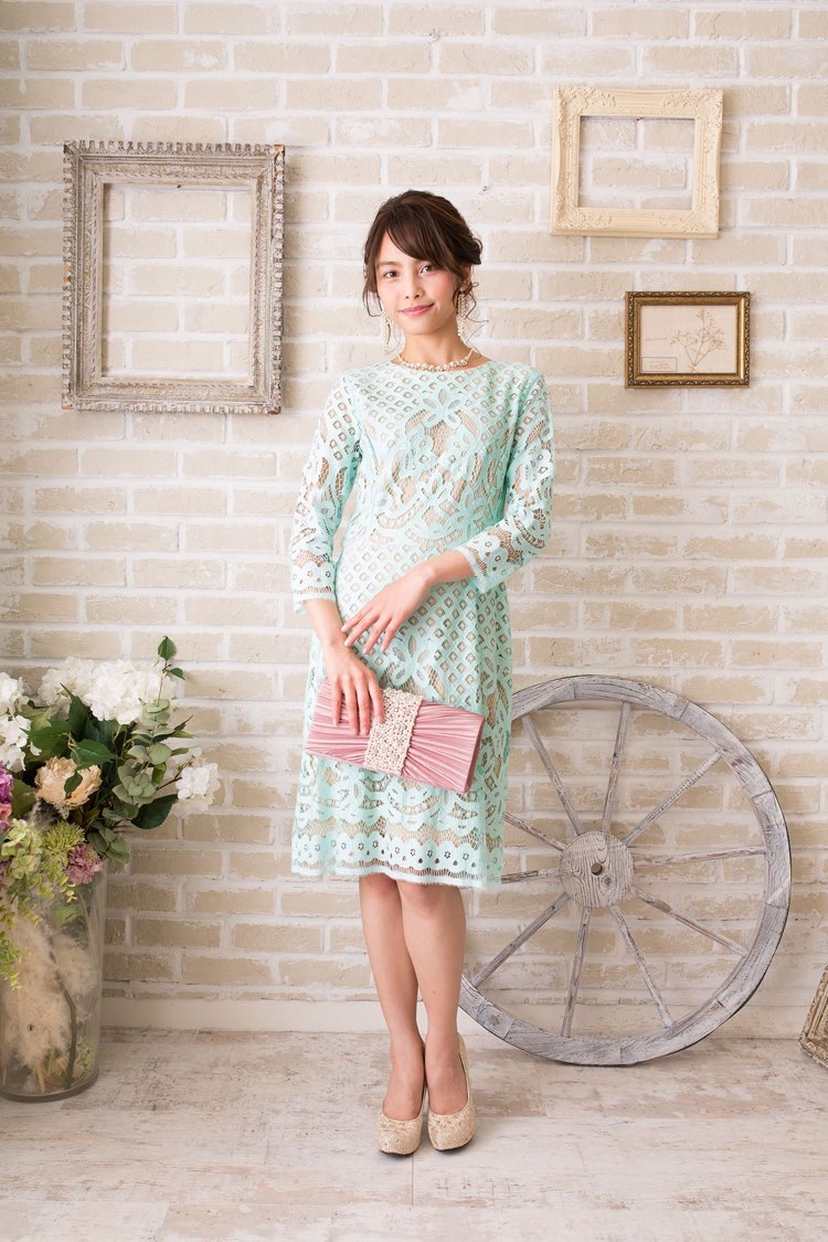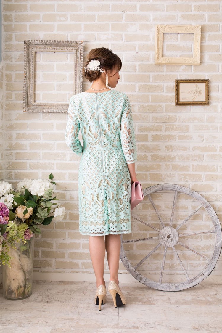 華やかで高級感あるレースがワンランク上の大人なティファニーブルーカラーんが印象的なドレス。シンプルなストレートシルエットのなかにお袖から透ける肌見せが大人っぽく上品な1着。トレンドのダマスク柄の全レース柄と透け感のある長袖が一段とお洒落に磨きがかかり素敵♪ 着心地にもこだわり、ほどよいゆったり感で座ったときの少し突っ張るような感覚を軽減。 シワになりにくい点も、座る時間の長い披露宴などにオススメです。 コーディネートが苦手な方も羽織物なしで品よく決まりますよ!