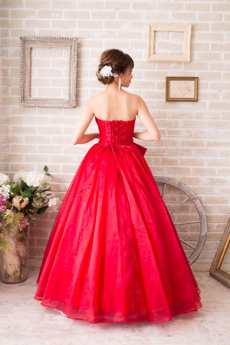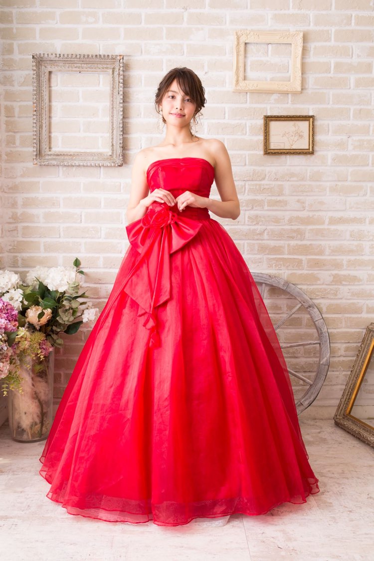 真っ赤がとても印象的な人気の床にすらないアンクル丈のウェスト切り替えボリュームドレスです。オーガンジー素材が素敵なシンプルなカラードレスをお探しの方にぴったりな綺麗なレッドカラーのドレスです。ウェスト切り替えドレスなので綺麗なボディーラインを演出しててくれます。ワイヤーパニエを入れるとよりボリュームも出て歩きやすくなり華やかになるのでオススメです。