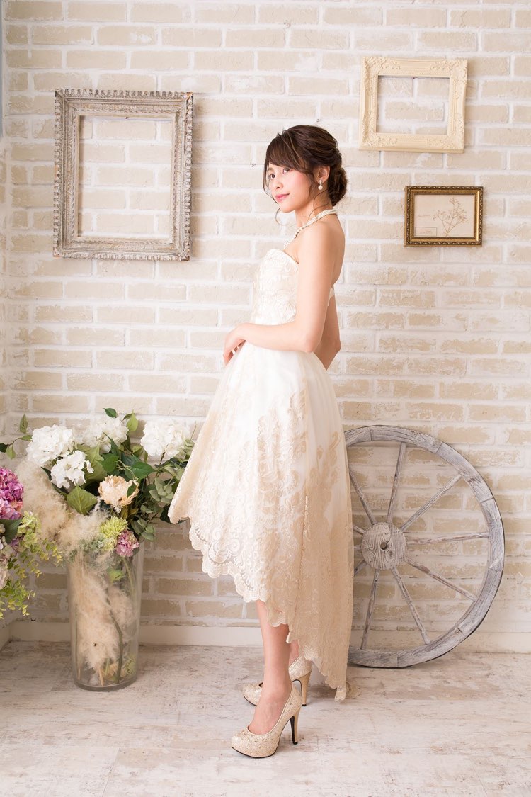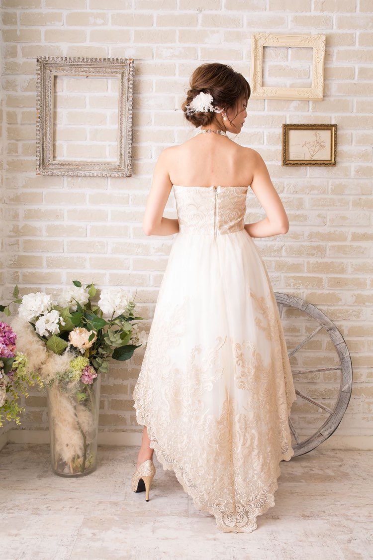 花嫁二次会向けのアシンメトリーで、フロント膝丈、トレーン長めのイルヘムデザインの個性的な一着。アイボリー地にゴールドのレース柄の4刺繍が全体にほどこされていとても素敵です。胸下切り替えなので脚長効果もあります。ベアトップのウェディングドレス。普通のドレスじゃ物足りない方にオススメの個性的なこだわり屋さんにぴったりなドレスです。