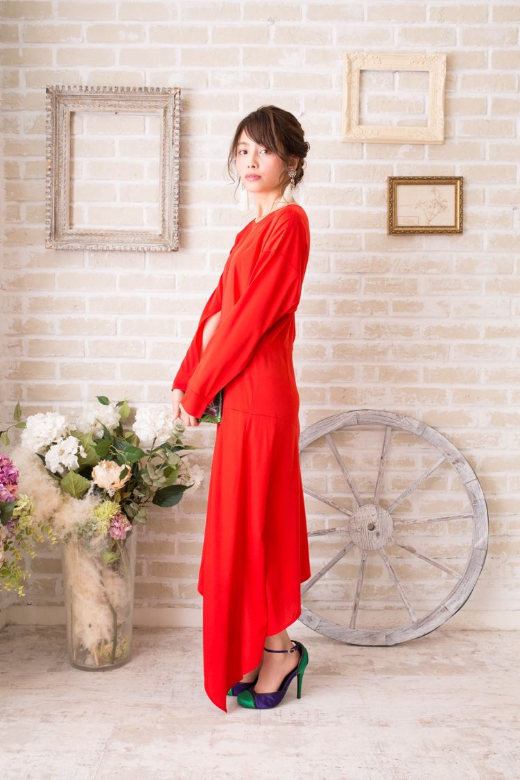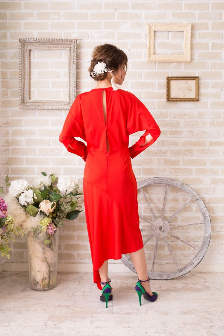 朱色カラーの長袖タイプのアシンメトリーなデザインの個性的なドレスです。モード感たっぷりなクールなデザインで存在感バッチリです。他の方とかぶりたくないオシャレ大好きな方におすすめです。生地は光沢のあるサテン地です。大きめのネックレスやアクセサリーを合わせてラグジュアリー感をだし、バッグも反対色のブルーやビビッドなイエロー柄物がオススメ。長袖なので一枚でさらっとオシャレに着こなせるのが魅力。結婚式や二次会、パーティーに◎。