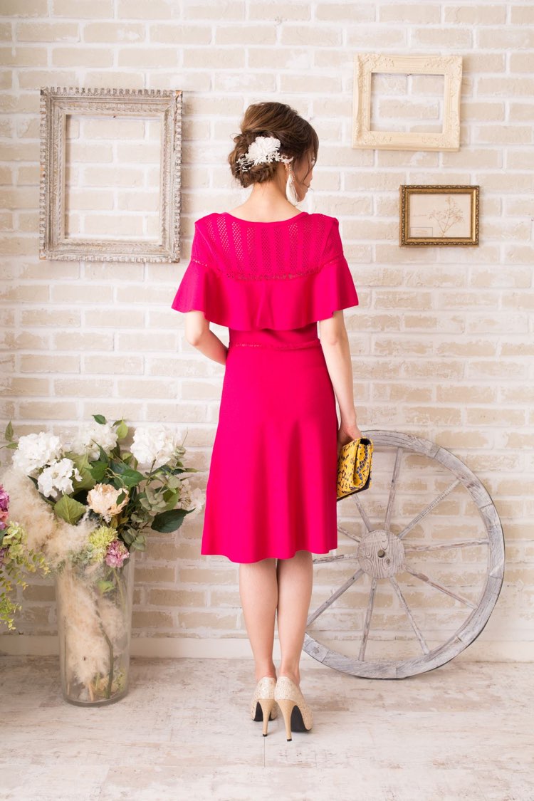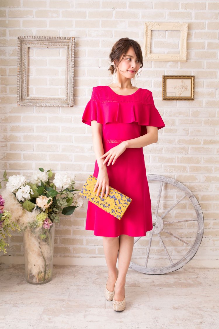 結婚式 二次会向け レッドカラーフレア袖膝丈ドレス