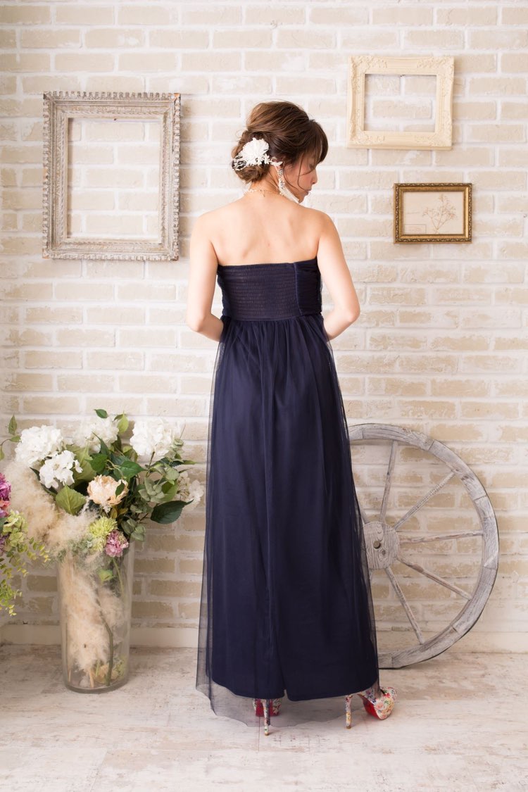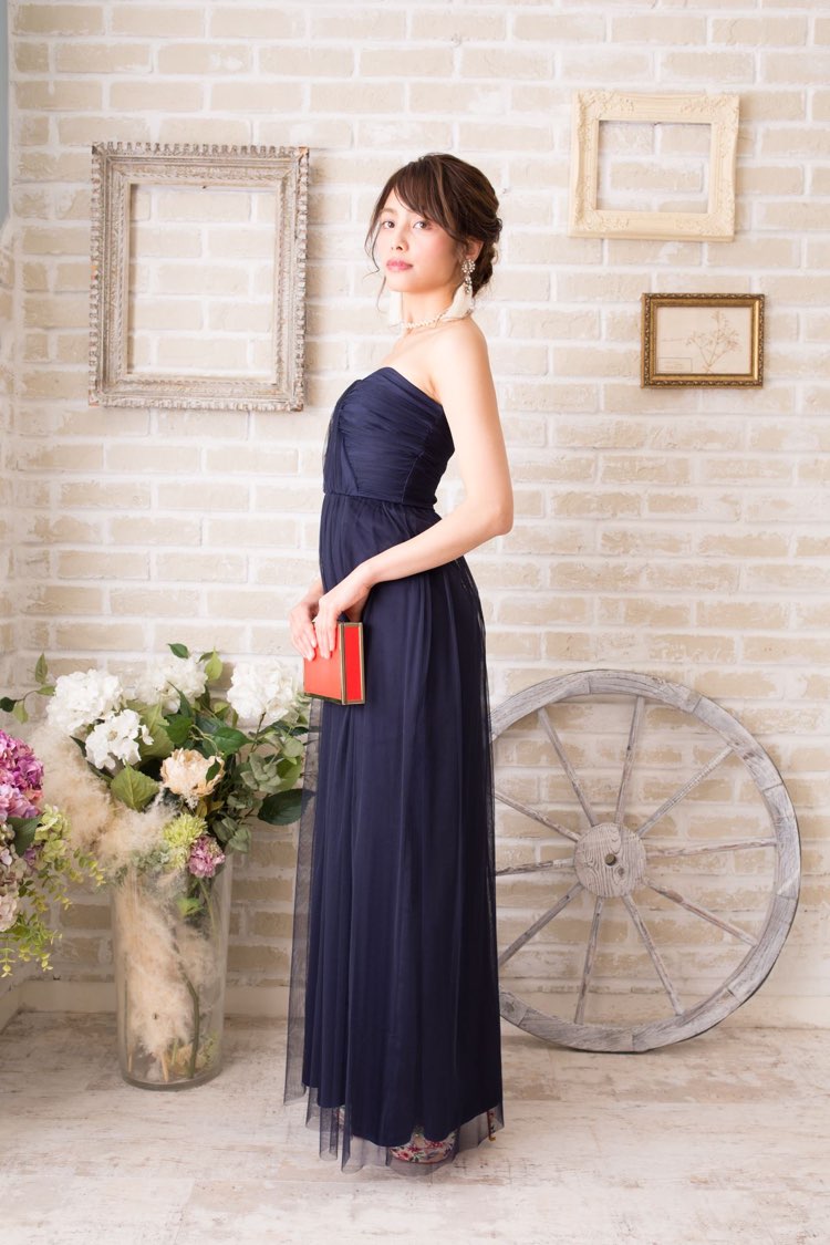 上品に着こなしたいネイビーカラーのシフォンロングベアドレスです。さらりとした生地は、着心地の良さとシルエットの美しさを兼ね備えています。ベアタイプなので、デコルテを綺麗に魅せてくれ、女性らしさと華やかなパーティー感も演出します。
