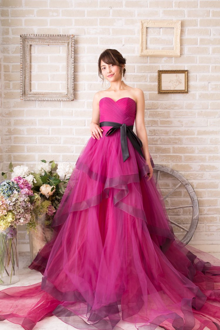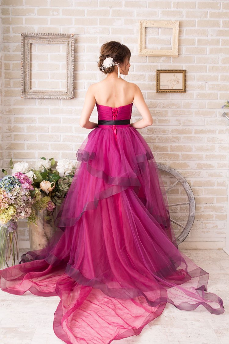 ワインレッドカラーとスカートの裾に濃いめカラーの切り替えのデザインはなびらのようなスカートの裾で広がり方がとても綺麗です。とても厳選された上質なチュール素材を使用しており豪華さと洗練されたここにしかない個性的な一着です。後ろは編み上げなのでサイズも合わせやすいドレスです。ワイヤーパニエを入れるとより一層歩きやすくてオススメです。ウェストのブラックリボンでより着痩せして見えます。結婚式のお色直しや二次会、演奏会にもオススメです。