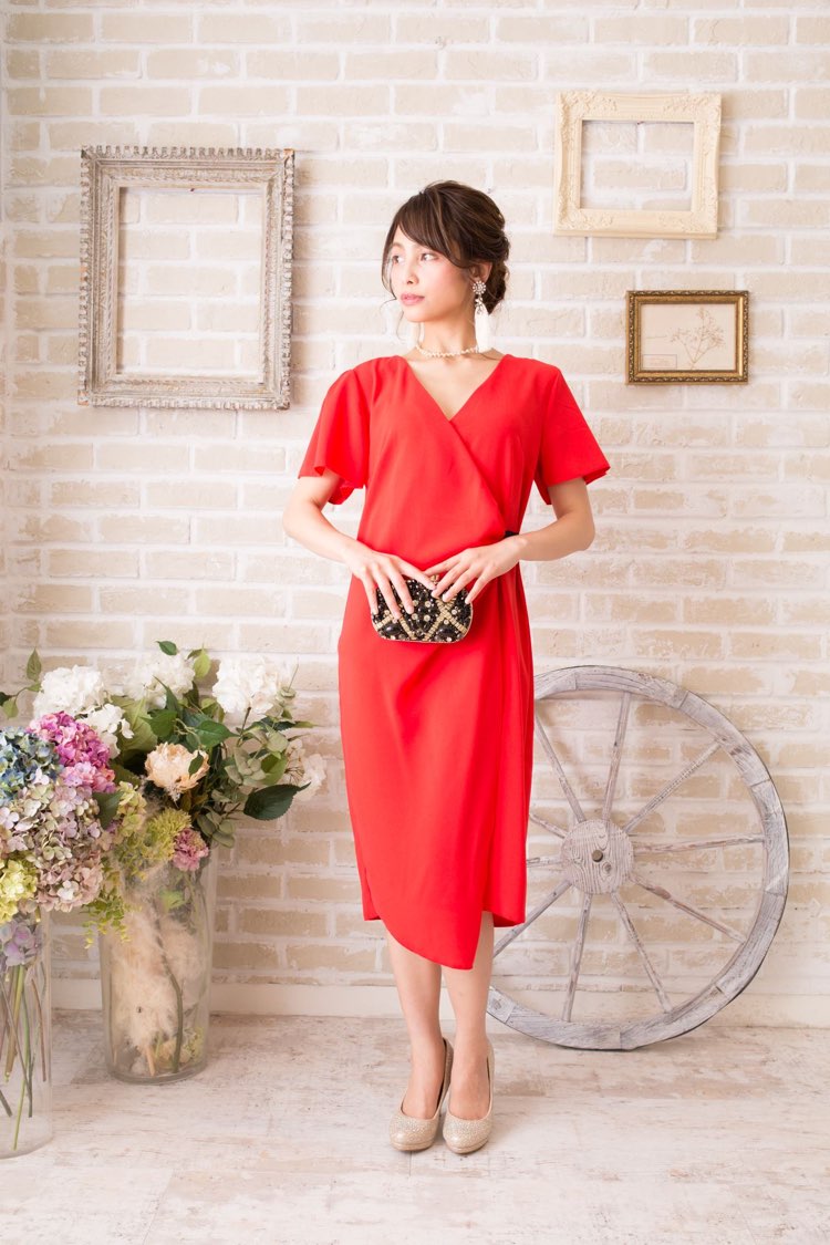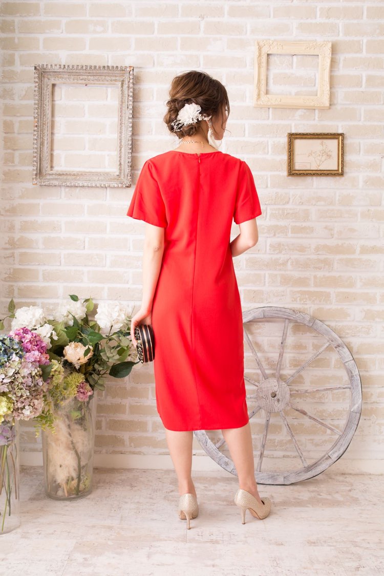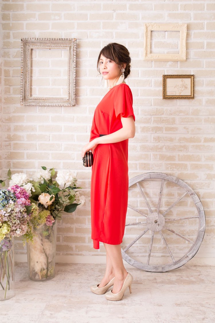 大人のエレガントさを放つレッドカラーのドレスです。サイドのブラックベルトが醸し出すモードなドレスデザインで、あなたらしい個性的なドレスアップを楽しんでみてはいかがですか。鮮やかなレッドカラーなら色被りの心配がなく、大人の女性の魅力を引き出してくれます。