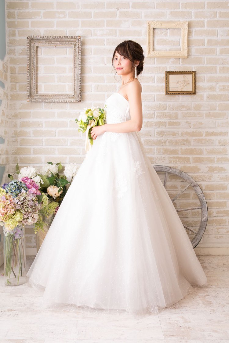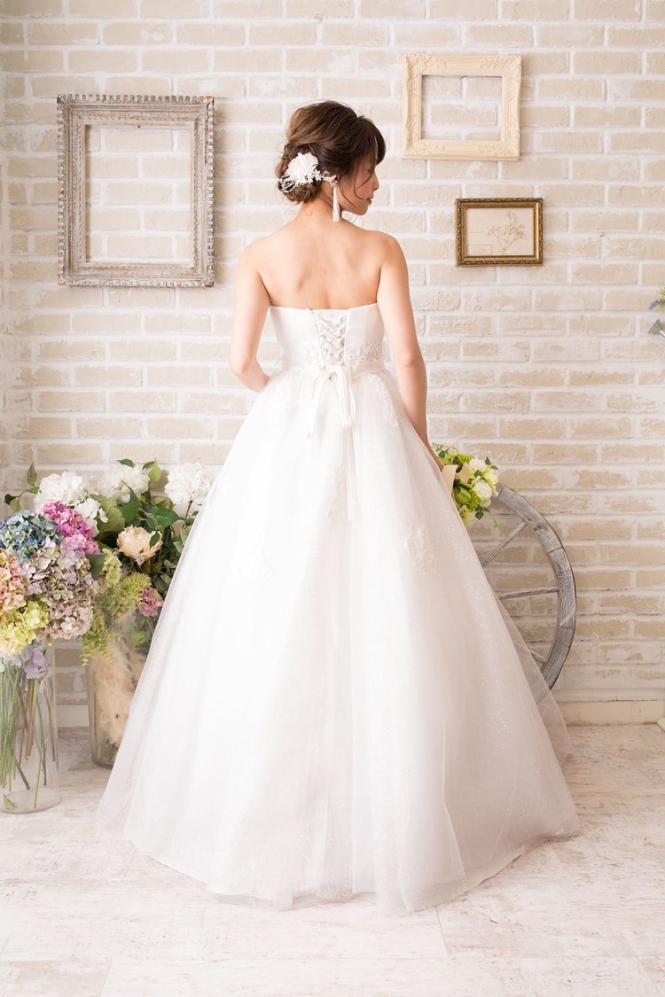 刺繍とビーズが全体に施されていてとても可愛いAラインのボリュームベアドレスです。胸の箇所はカップが入っており、スカートはシフォン素材なので軽くて動きやすいので結婚式の二次会ドレスや1,5次会ドレスにオススメです。ワイヤーパニエを入れるとより歩きやすくオススメです。