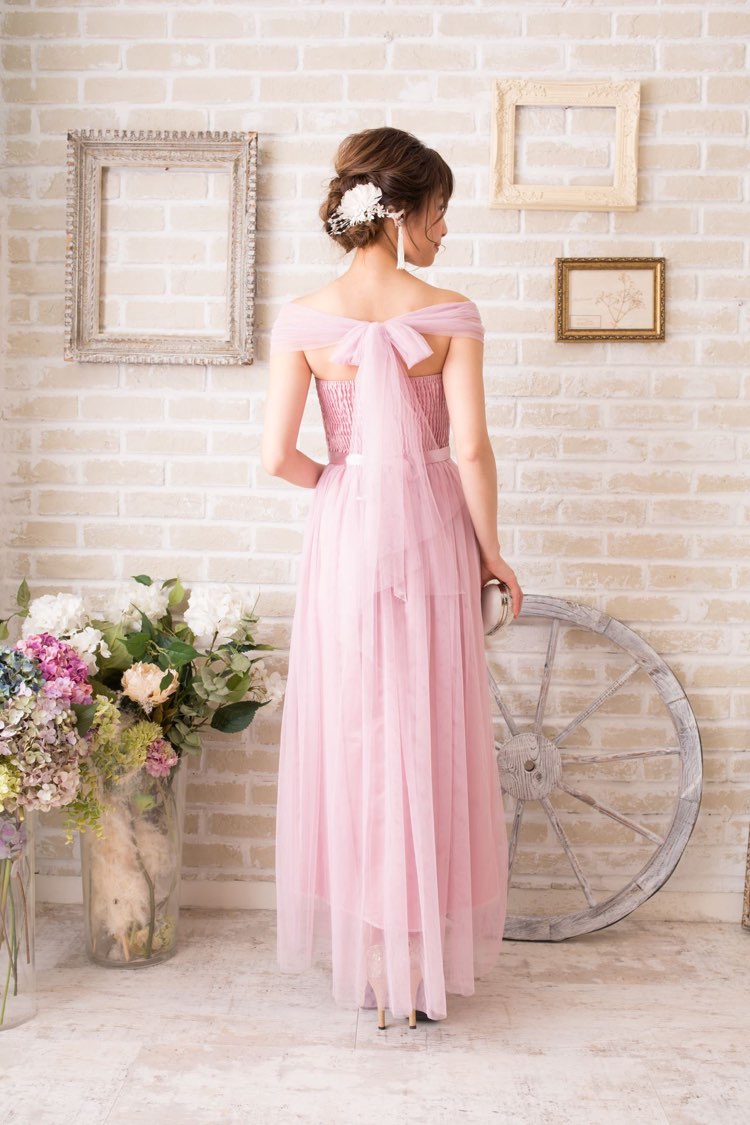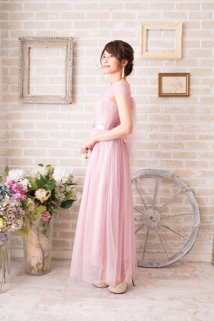 スモーキーピンクカラーのトップスレースでスカートはチュール切り替えです。甘すぎないくすみのかかったピンクが大人の女性にもぴったりなドレスです。二の腕がちょうど隠れるチュール素材のオフショルダーがついているので一枚でさらっと着こなせます。サイドチャックの後ろはゴムになっているのでサイズもある程度の幅がききます。着丈もアンクル丈なので歩きやすくスカートが床にすらないので安心です。同じカラーでデザインが違うノースリーブタイプはYK436です。ブライズメイドドレスとしてもご用意があり合計19着あります。