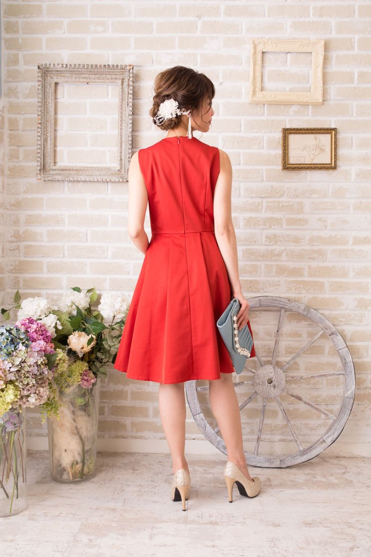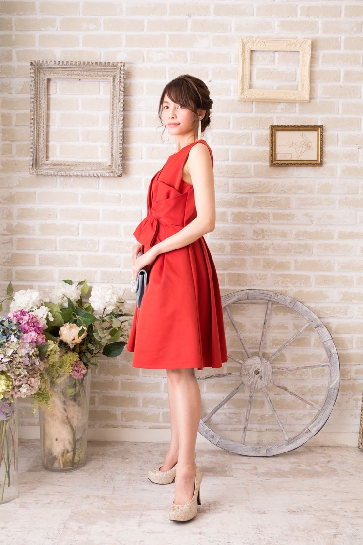 大人可愛いを叶えるレッドカラーのノースリーブフレアスカートドレス。視線を集めるウェストリボンで、お洒落女子からも注目されるコト間違いなし!