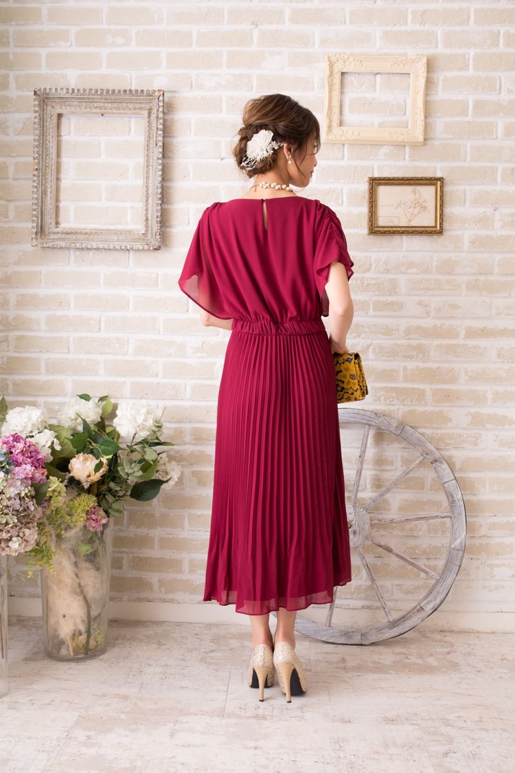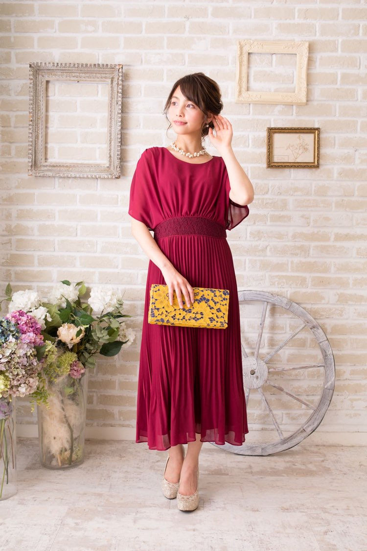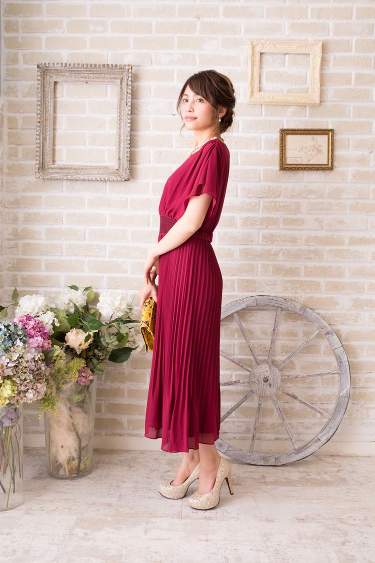結婚式やパーティーなどにおすすめの落ち着いたレッドカラーのドレスです。フレアの袖付きなので一枚でさらっと着こなせます。高い位置のウェスト切り替えドレスに加えて切り替えのスカートが細めのプリーツスカートなので縦長効果とうぇすと切り替えのW効果ですっきりと痩せて見せてくれます。着丈がひざ下でミモレ丈くらいあるので上品に着こなせます。ご親族の結婚式や、スピーチで人前に出るときにもちょうどいい華やかさと上品さをかな揃えているのでばっちりです。大きめのネックレスやボリュームのあるショートネックレス、ビビッドカラーのクラッチバッグや柄物、ビジュークラッチなど、華やかさのある小物が好相性です。
