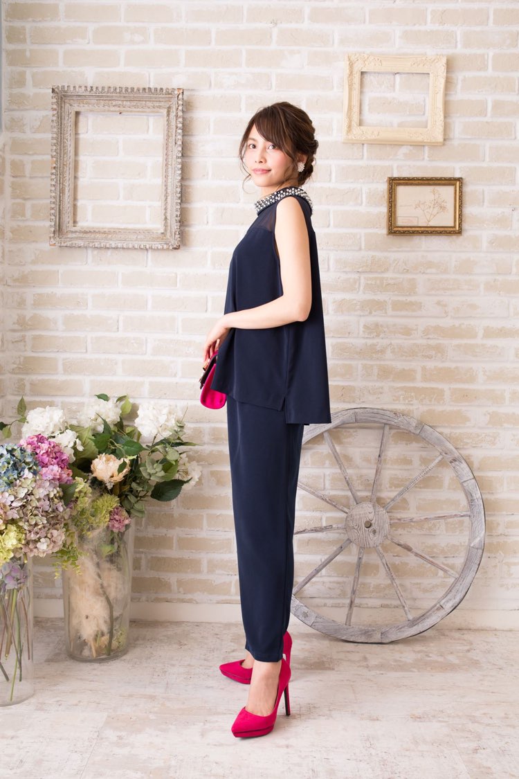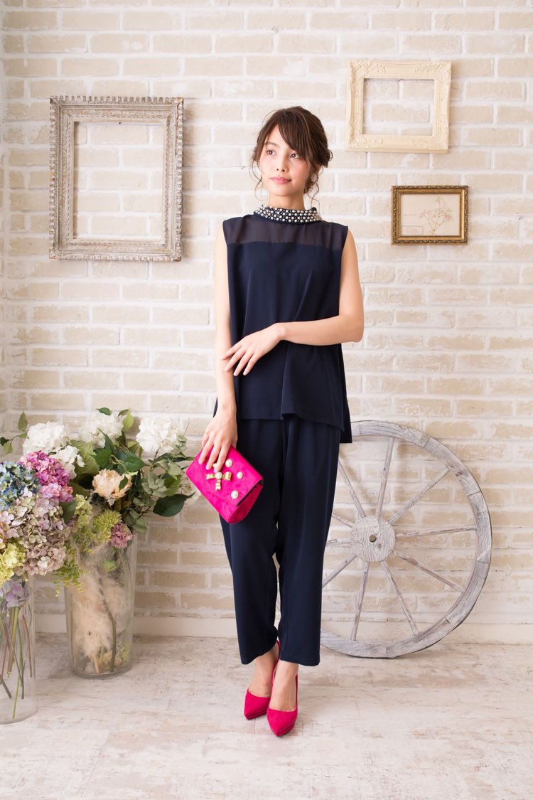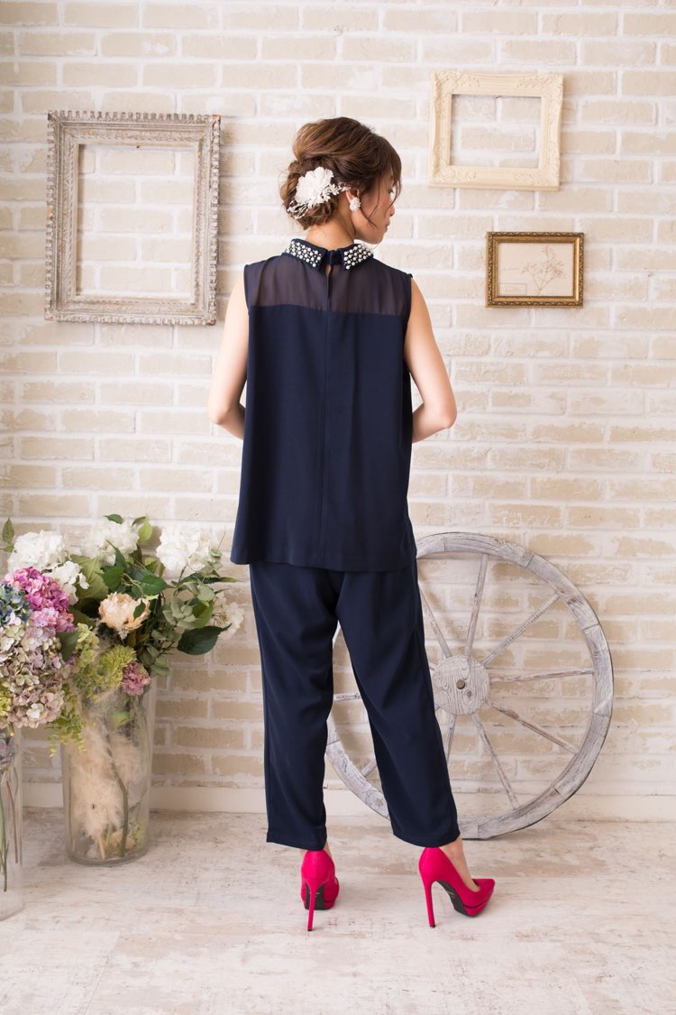 婚式・謝恩会・女子会・お呼ばれ対応パンツセットアップドレス》滑らかで肌触りの好い素材を使用したパンツとロールカラーのトップスに首元にパールとビジューが付いたパンツドレスです♪程よい抜け感のあるシルエットのブラウスに、センタープレスを効かせた美脚ユルラインパンツの魅力的なセットアップです♪