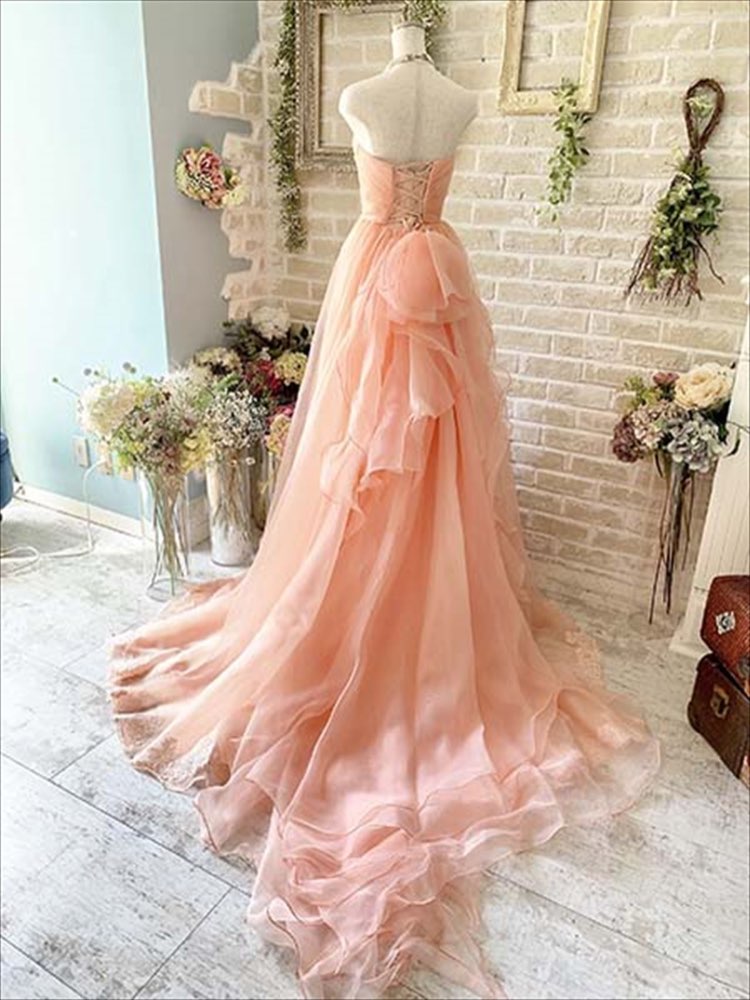 女性らしいコーラルオレンジのドレスです。編み上げタイプなので、ぴったりとお身体にフィットさせることができ、お腹まわりをすっきりと見せてくれます。花嫁さんの二次会ドレスとしても、披露宴でのお色直しとしてもオススメです。 付属のトレーンを付ければ、フェミニンルックにクラスアップさせてくれ、繊細なゆらめきも演出してくれます。 可愛らしい雰囲気がお好みのご新婦様におススメの一着です。