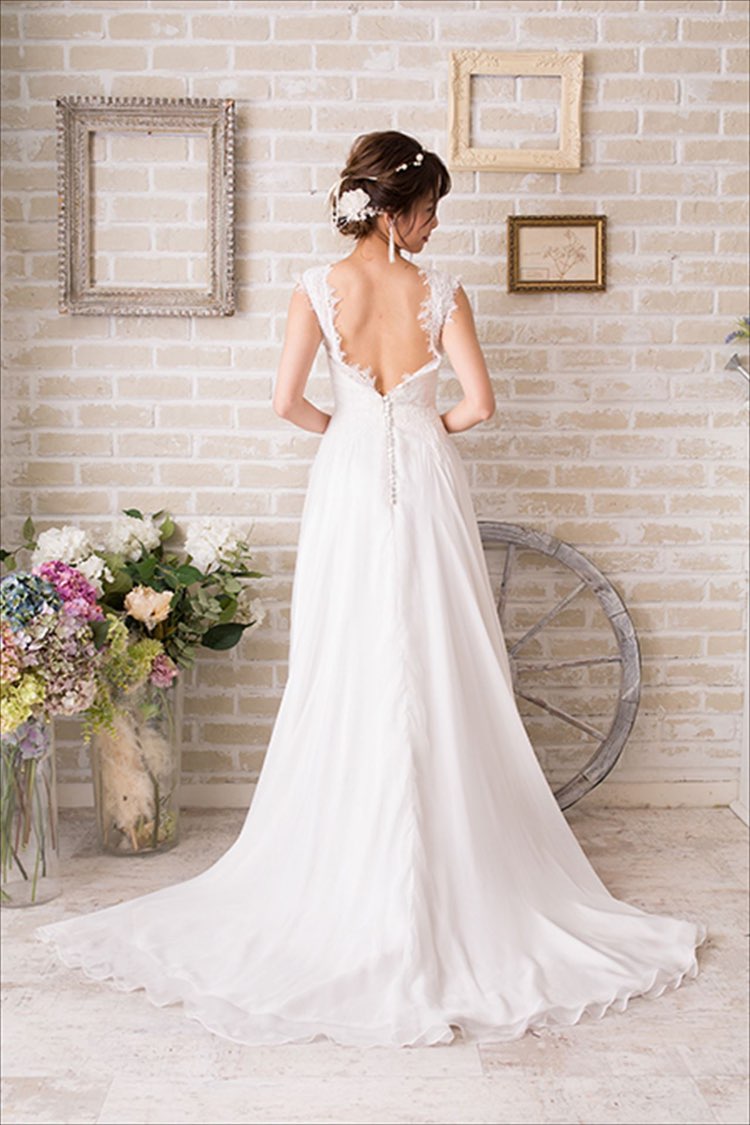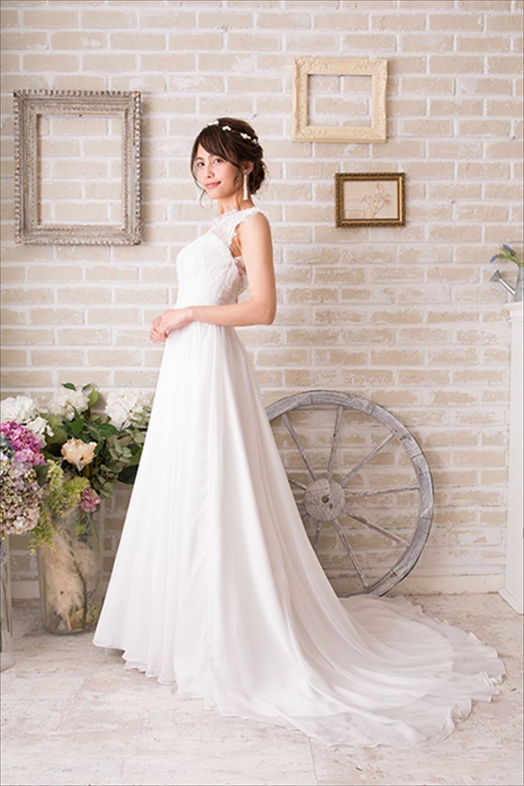 繊細なレースと高級感あふれるオーガンジー素材が贅沢に施された大人で上品な大人気のノースリーブタイプのAラインドレスです。大きく開いた背中とデコルテラインから肩にかけて透け感のある刺繍のレースが大人可愛い印象に。トレーンは程よく長めなので大きめの会場の二次会や1,5次会、フォトウェディング、カジュアルな結婚式や披露宴におススメです。。 ドレッシーな中にも女性らしさも加えたスタッフ激推しの一着です。