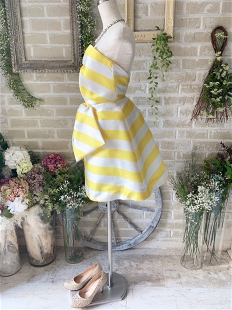 個性的で可愛い印象のミニベアドレス。ハリのある生地を使用しているので着崩れることがなく、パニエなしでもしっかりとボリュームが出ます。ブラックの小物で大人可愛くも、アイボリー系の小物でフェミニンに甘さをプラスしてもGOOD。 結婚式はもちろん、二次会などのパーティーシーンや謝恩会にもお勧めです♪