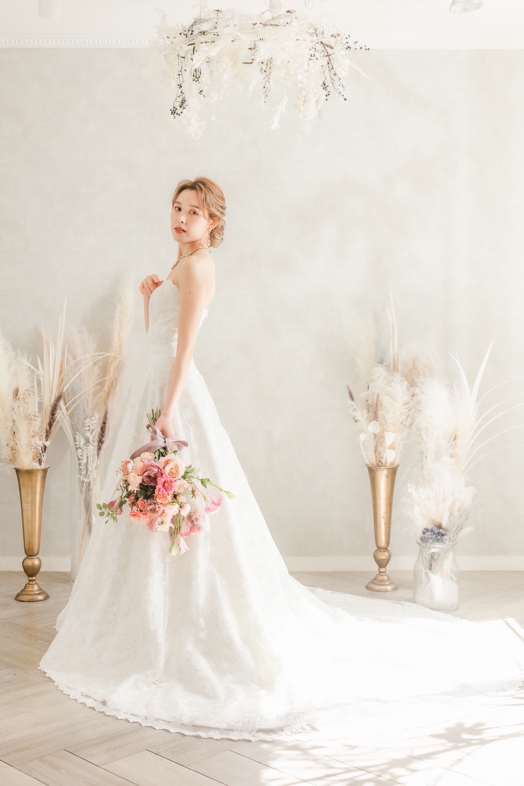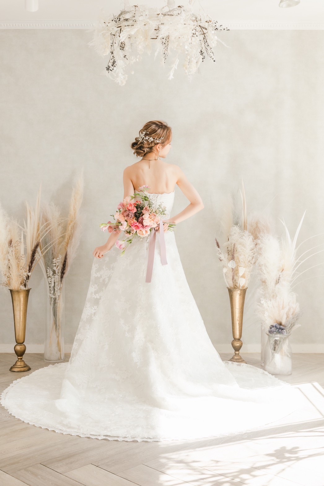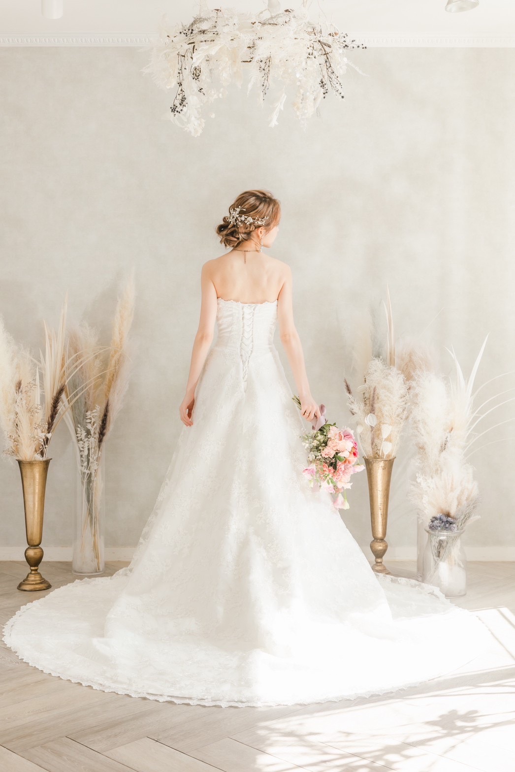 気品あふれる総刺繍が印象的なウエディングドレス。高級感のある生地は、着る全ての人をラグジュアリーなイメージに仕上げてくれます。総編み上げのタイプなので、幅広いサイズ感の方にジャストフィットで着ていただけます。 トレーンは長すぎない絶妙な丈感で、?5次会や前撮りにもおすすめです。 一生に一度の大切な日に、ぜひこのドレスで彩りを添えてみてはいかがでしょうか。