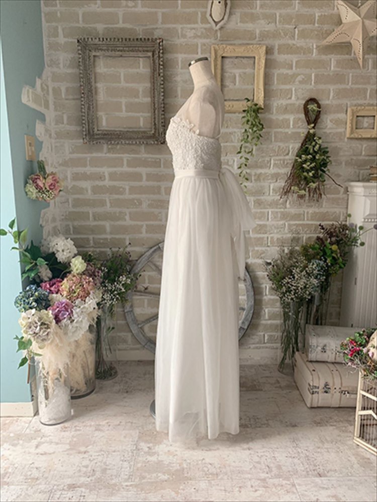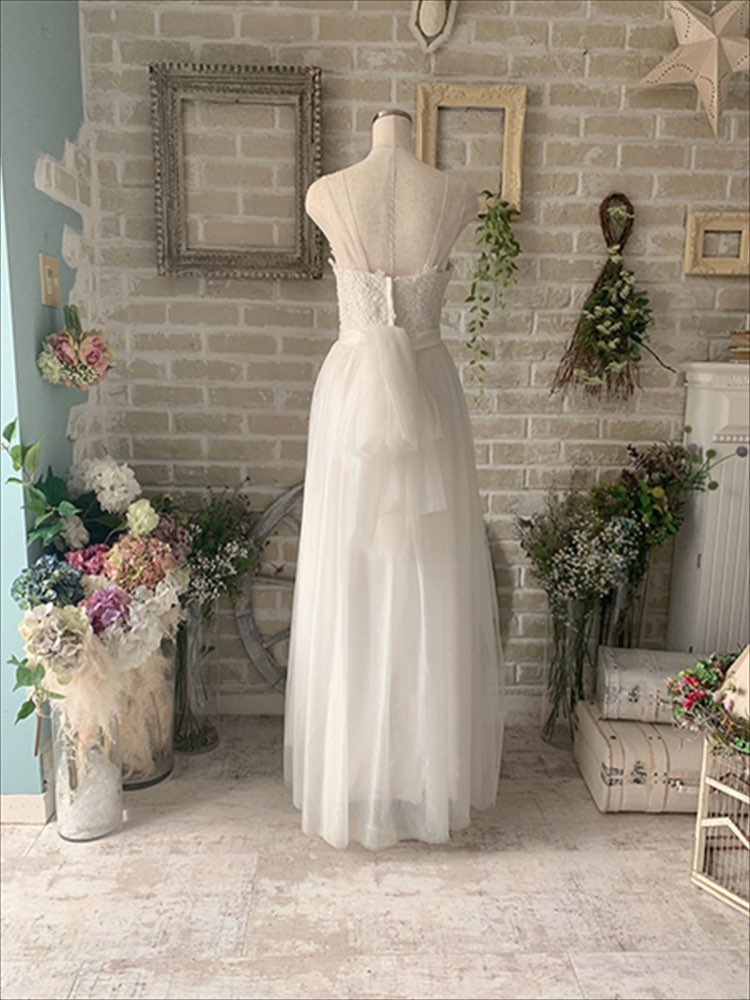 フロントにあしらわれたお花の刺繍が可愛らしい印象のウエディングドレス。ノースリーブなので、ベアタイプだと不安な方にも安心して着ていただけます。また、お袖の部分がシースルーになっているので、肩幅が気になる方にもオススメです。 動くたびにチュールがふわりと揺れ、花嫁様の可憐さをより一層引き立たせてくれることでしょう。