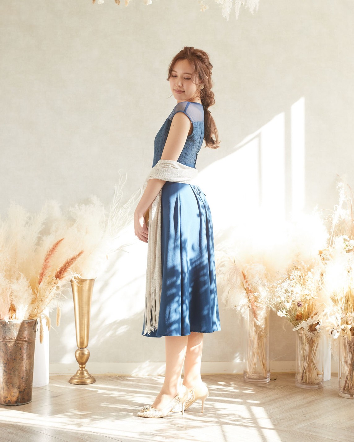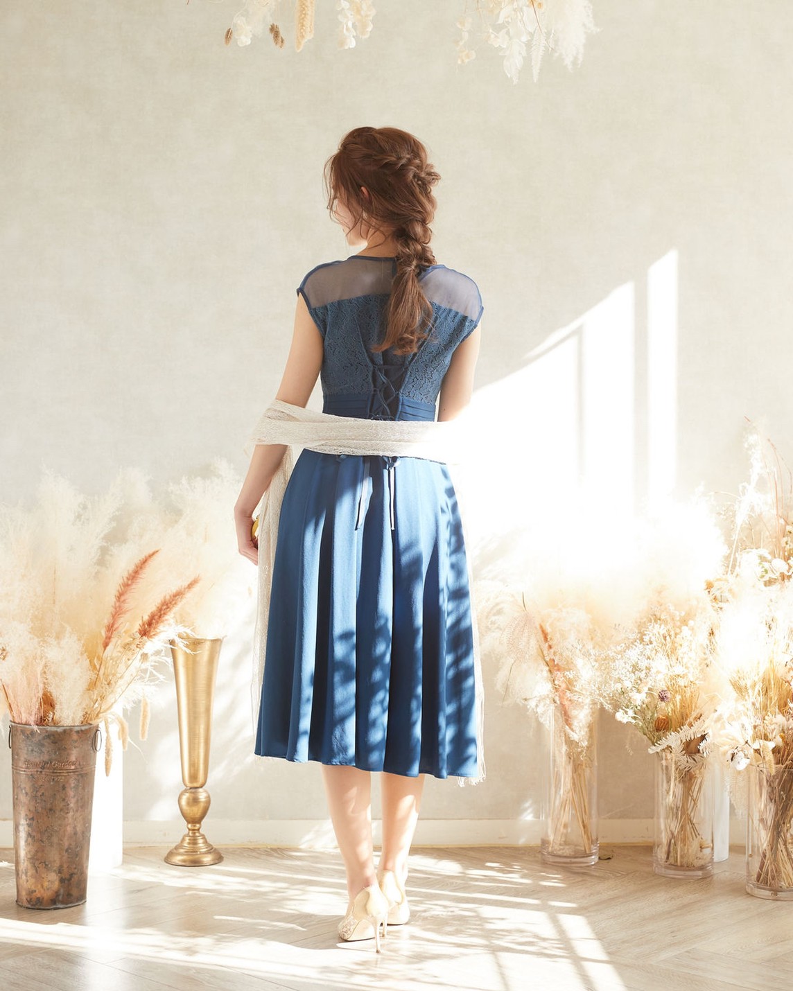 深いグリーンカラーが落ち着いた印象のドレス。後ろが編み上げになっているので幅広いサイズ感の方にジャストフィットで着ていただけます。丈感も品のあるミモレ丈で、動きやすさも抜群です。 ご友人やご親族の結婚式にはもちろん、ちょっとしたお呼ばれやお食事会、顔合わせなど様々なシーンで大活躍間違いなしの一着です。