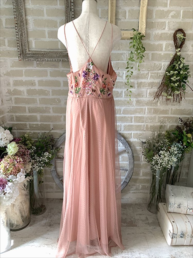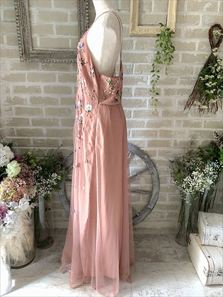 落ち着いたカラーと色とりどりの小さなお花刺繍がナチュラルな印象のロングドレス。キャミソールタイプなので、ベアタイプだと不安な方にも、肩幅が気になる方にもオススメです♪比較的軽めの生地を使用しているので、動きやすさも抜群です◎ ブラックの小物で大人可愛くも、アイボリー系の小物でフェミニンに甘さをプラスしてもGOOD。 ガーデンウエディングへの参列や、カジュアルなパーティーシーンで大活躍の1着です。