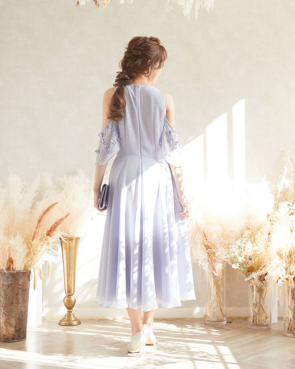 フロントにあしらわれたお花の飾りが可愛らしく個性的な印象のドレス。オープンショルダーなので女性らしい華奢感がこの1枚で簡単に演出できます♪トレンドのくすみカラーと絶妙なミモレ丈で、気品のある清楚感も抜群です! ご友人やご親族の結婚式にはもちろん、ちょっとしたお呼ばれやお食事会、顔合わせなど様々なシーンで大活躍間違いなしの一着です。