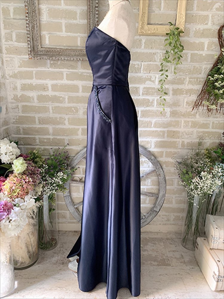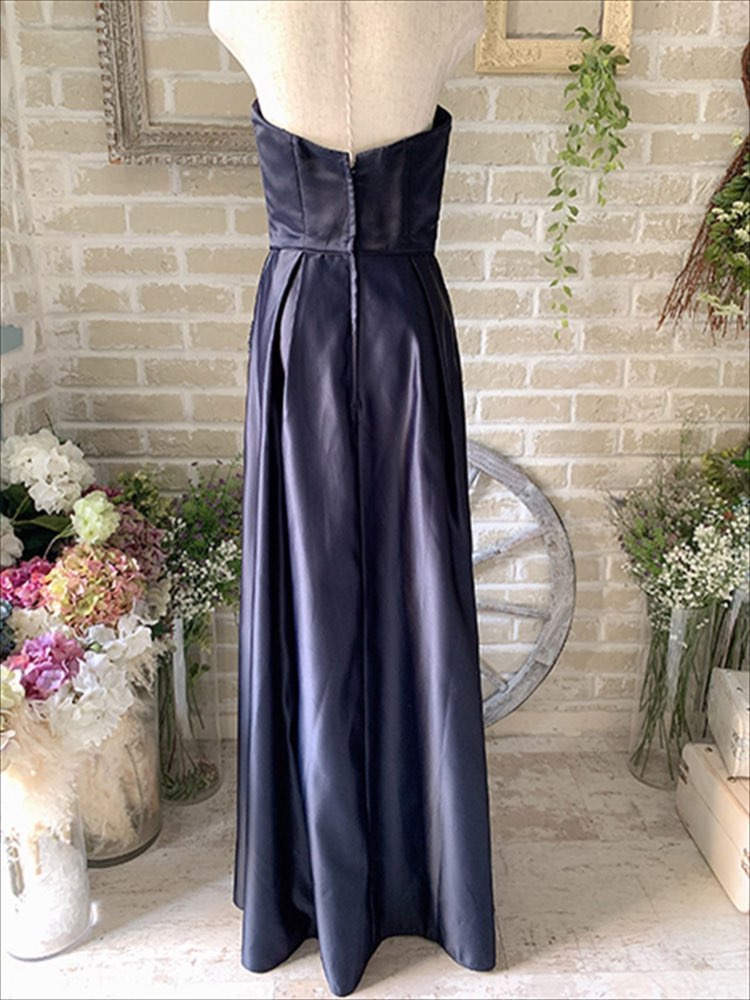 光沢感のある生地が一際上品な印象のロングドレス。フロントがストレートなタイプなので、ベアドレスに抵抗のある方にも比較的安心して着ていただけるかと思います。左右のポケットはフェイクではないので実用性も抜群です◎