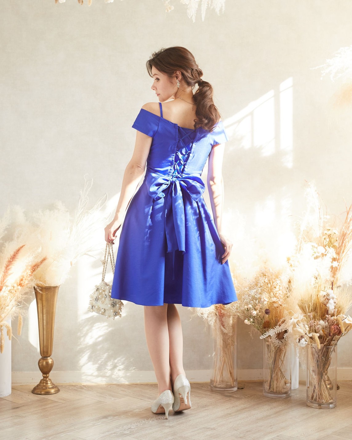 ハリのある生地感が品のある印象のドレス。オープンショルダーや編み上げ、大きなウエストリボン等女の子のだいすきなディティールがたくさん詰まった1着です。ブルーカラーなので甘すぎるイメージにならないのが嬉しいポイント◎ 1枚で誰でもおしゃれを楽しめる魅力的なドレスです! ブラックの小物で大人可愛くも、アイボリー系の小物でフェミニンに甘さをプラスしてもGOOD。 結婚式はもちろん、二次会などのパーティーシーンや謝恩会にもお勧めです♪