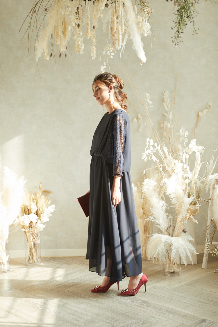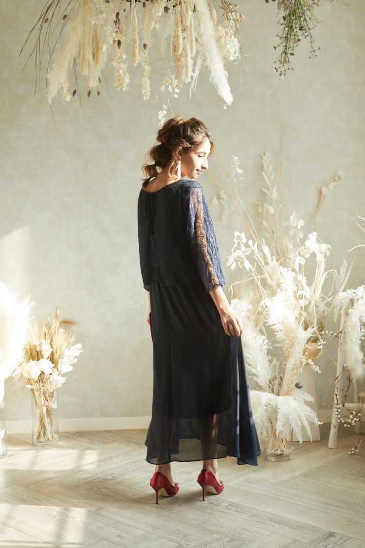 大人で上品でクールなネイビーカラーのドレス。袖は繊細な総レースとシフォンの切り替えドレスは、おしゃれな女子から一目置かれること間違いなしの一着。バックのデザインもレースとシフォンの切り替えの二層構造になっておりこっていてリボンで結ぶデザインも可愛いです。羽織物が苦手な方にもうれしいロングスリーブなので、一枚でドレスアップが決まります!上品なミモレ丈で安心。