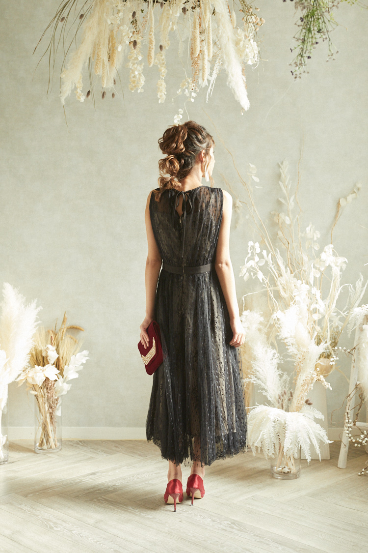 溢れる気品でラグジュアリースタイルをお楽しみいただけるミディミモレ丈のドット×ストライプチュールレースドレスです。ブラックの総レース素材×ミディ丈の大人かつドットチュールの可愛さをコラボさせたトレンドのドレスです。裏地に施されたベージュの色味が、女性らしさをそっと柔らかに寄り添わせます。 美しいウェスト切り替えラインで細見え効果も◎。 高めのパンプスで着こなせば、より理想的なドレスアップが叶いそう。