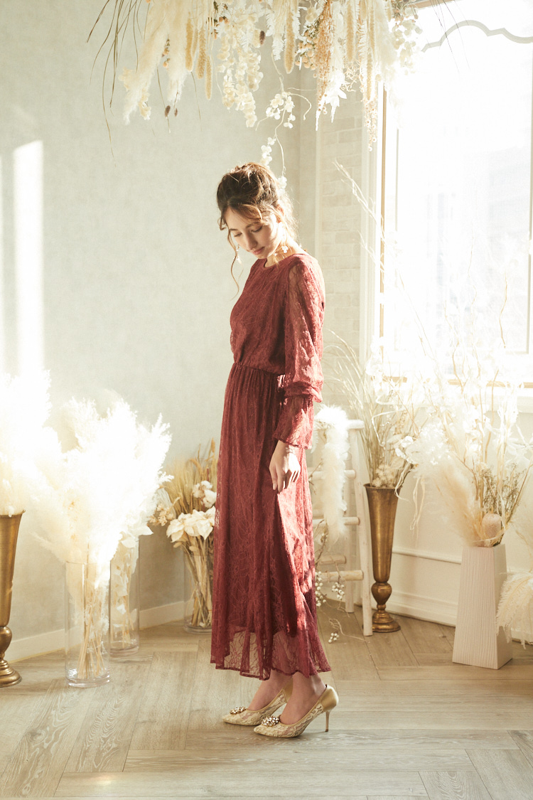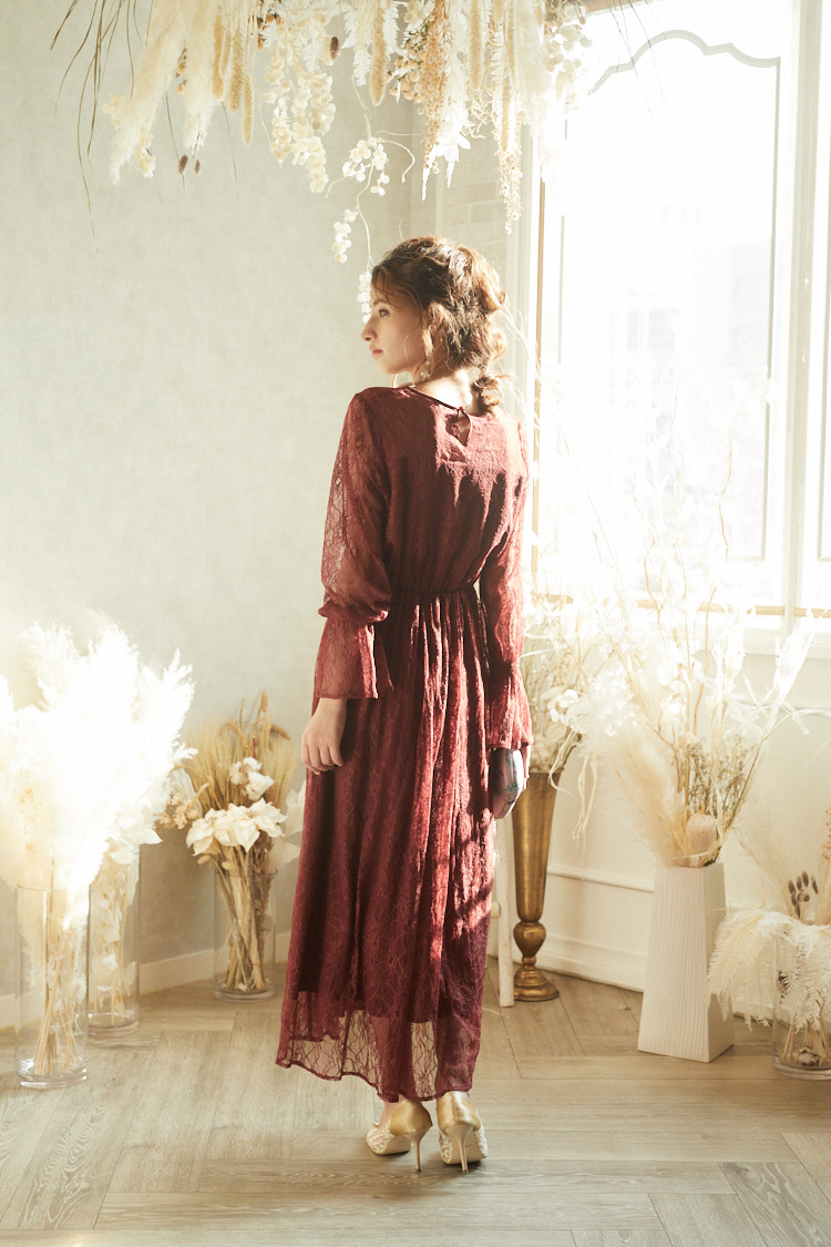 トレンドを楽しめる大人フェミニンなボルドーカラーのドレス繊細な総レースのドレスは、おしゃれな女子から一目置かれること間違いなしの一着。羽織物が苦手な方にもうれしい6分袖のベルスリーブつきなので、一枚でドレスアップが決まります!