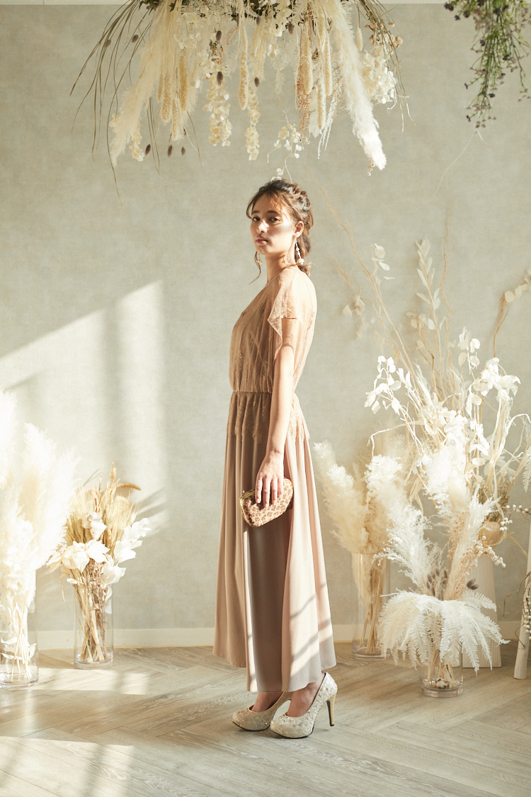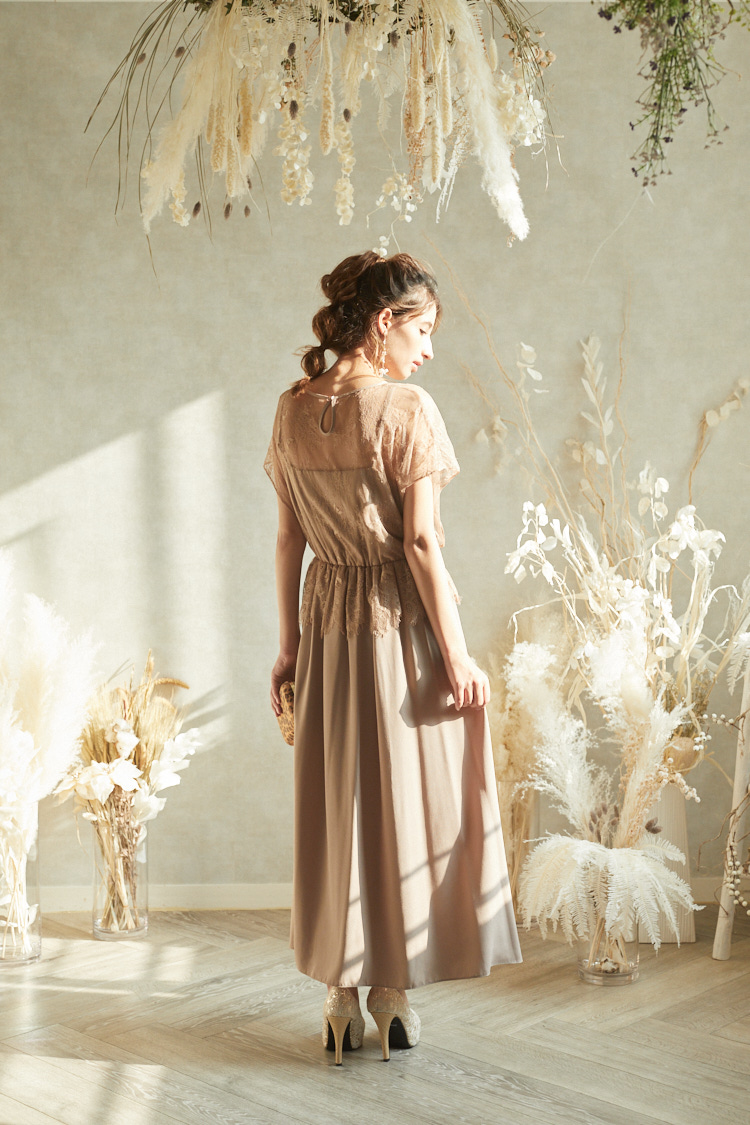 大人で上品なトレンドカラーのモカカラーのドレスフロントの繊細な総レースとシフォンの切り替えドレスは、おしゃれな女子から一目置かれること間違いなしの一着。羽織物が苦手な方にもうれしいフレンチスリーブなので、一枚でドレスアップが決まります!