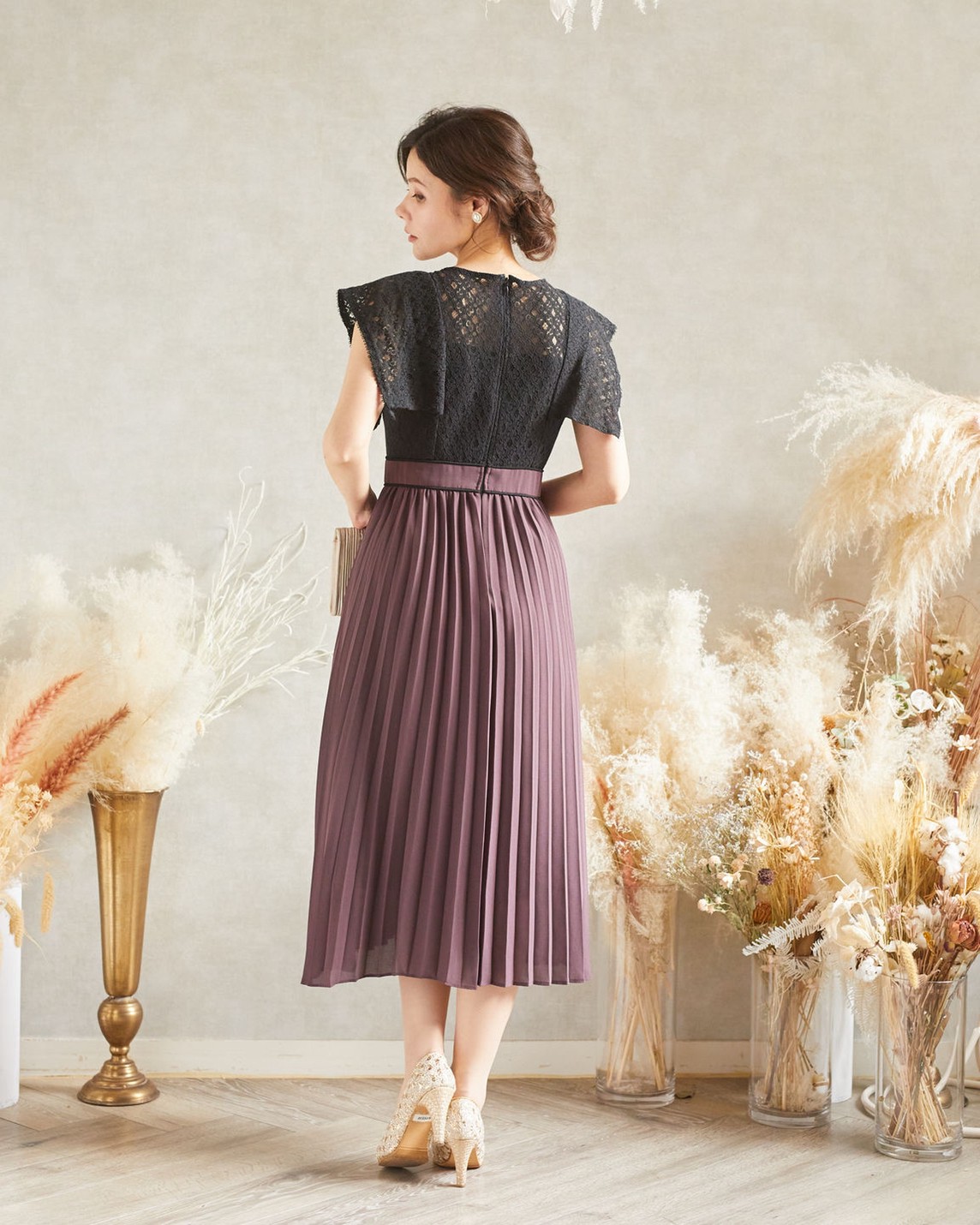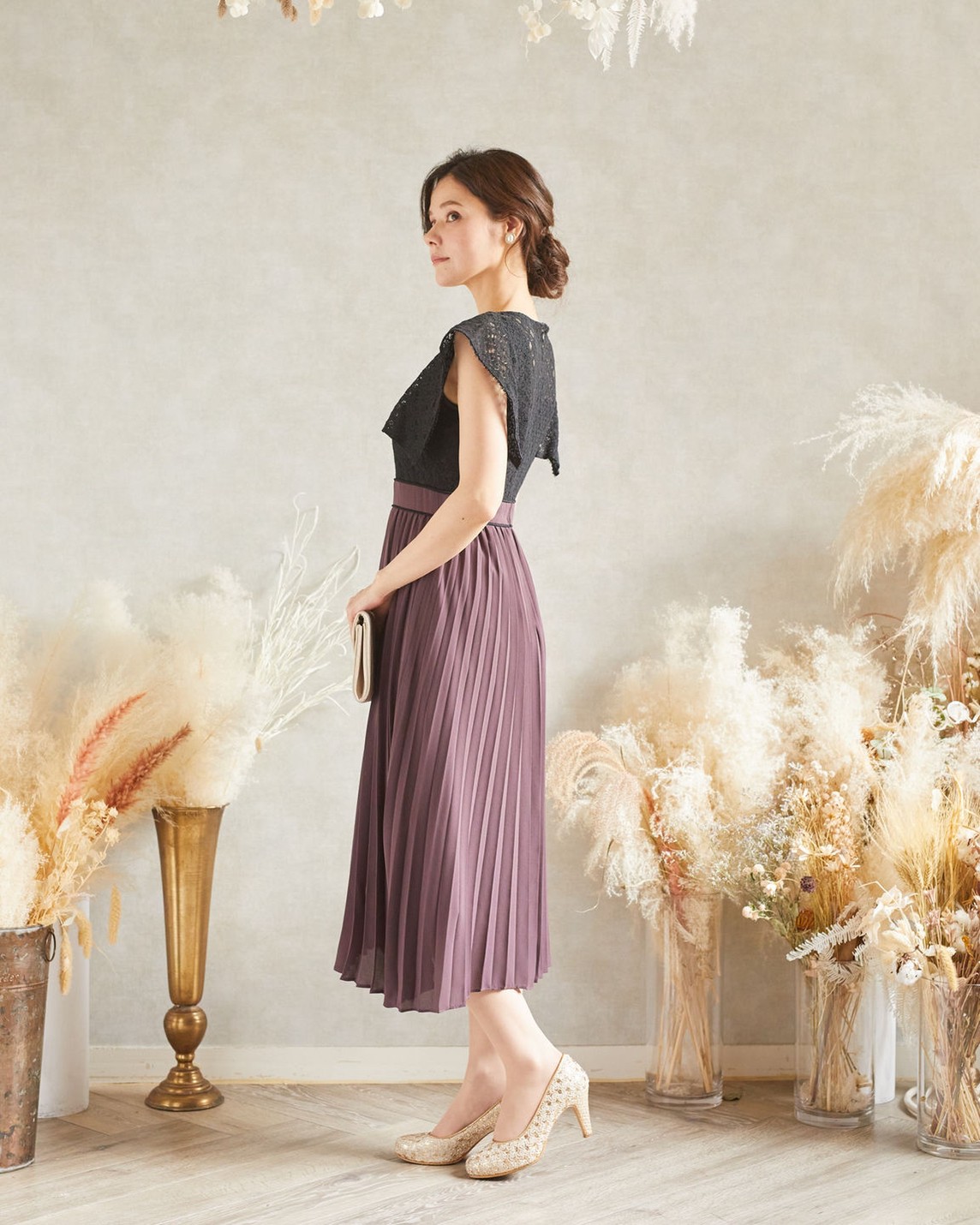 トレンド感たっぷりのおしゃれ個性派好きの方におすすめなクールなブラック×パープルのバイカラーのドレス。袖は繊細なコットンレースとのジオーゼットプリーツ切り替えドレスは、おしゃれな女子から一目置かれること間違いなしの一着。羽織物が苦手な方にもうれしいスリーブつきなので、一枚でドレスアップが決まります!上品なミモレ丈で安心。