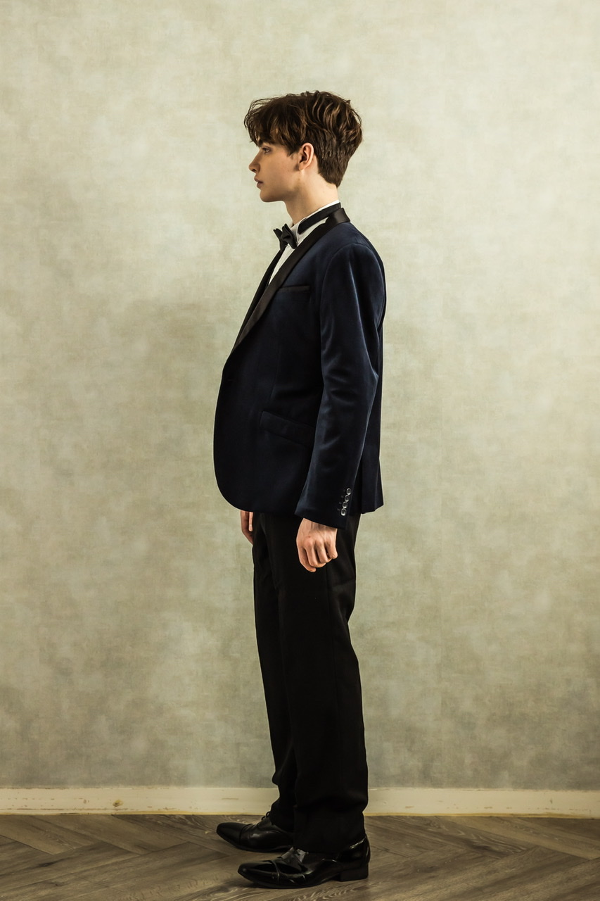 光沢のある少し明るめのネイビーベロア素材のタキシードジャケット。黒のショール・カラータイプ。こちらはジャケット単品の展開。パンツは無地のネイビー、グレーのスラックスや、ホワイトデニムやチェック柄のパンツでも相性良いです。ベストはチェックやストライプ柄、スモーキーピンク、ライトグレー、ベージュ、シルバー、ワインレッド、ホワイトなどのベストを差し色として合わせるのもオススメです。合わせるシャツをチェック、ドット、ストライプ、花柄、ネイビー、ブラック、グレーシャツで合わせてカジュアルな二次会タキシードとしても素敵。また白のウィングカラーシャツを合わせればきちんとした結婚式や披露宴向けのフォーマルなコーディネートになります。結婚式・ゲスト結婚式の参列向け。パーティースーツ・二次会・海外ウェディング・フォトウェディング、前撮りにまで幅広いシーンでご使用いただけます。秋・冬のシーズンに適してます。